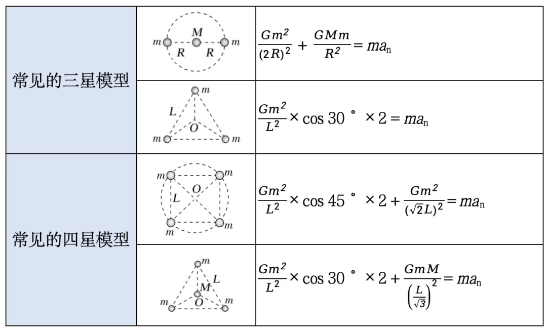 2.三星和四星模型所研究星体所受万有引力的合力提供做圆周运动的向心力,除中央星体外,各星体的角速度或周期相同。