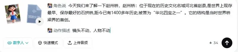 选择数字人,插入下载好的图片,音频按需选择,我选择了活泼女孩的音频,然后输入角色要说的话,并进行动作描述,如下所示: