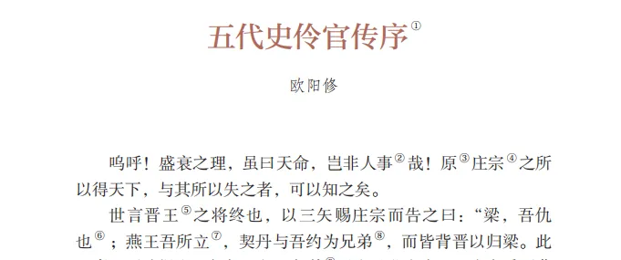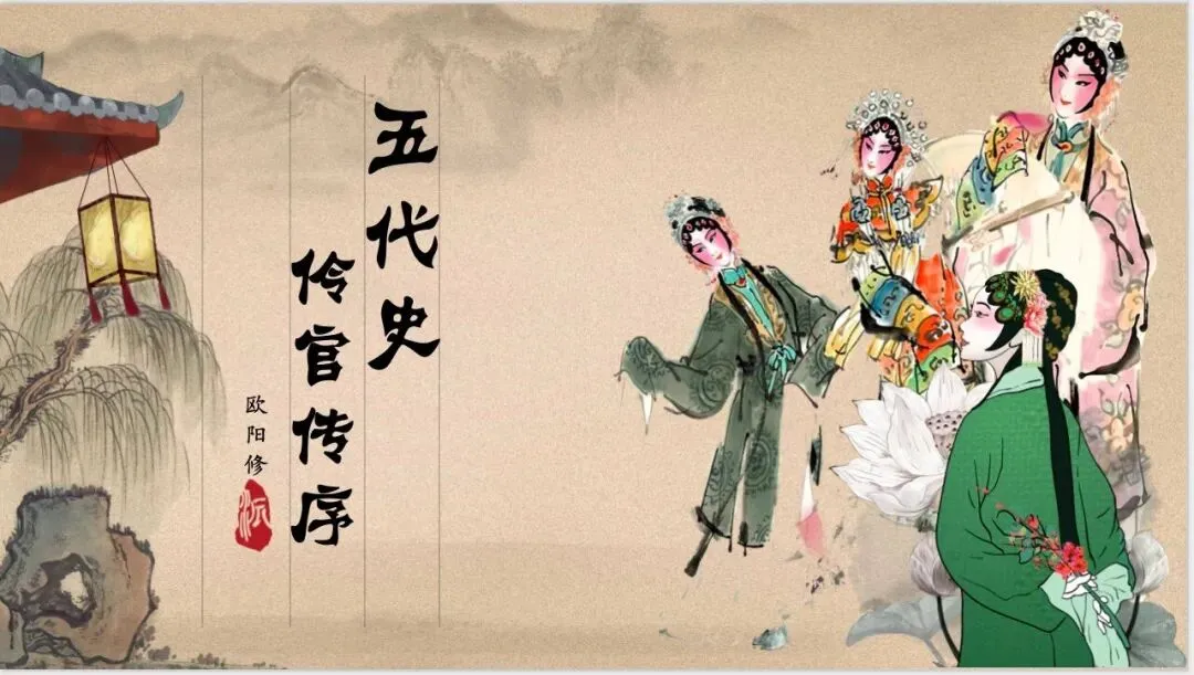 《新五代史》是“二十五史”之一,原名《五代史记》,为与北宋初年宰相薛居正奉诏监修的《五代史》区别,称《新五代史》。《伶官传序》是欧阳修为《新五代史•伶官传》作的序言。《伶官传》是一篇合传,写了敬新磨、景进、史彦琼、郭从谦四个伶人。欧阳修作《伶官传》并冠以短序,目的是评述伶官受宠幸而乱政的史实,为了告诫当时北宋统治者,应当吸取历史教训,居安思危,防微杜渐,不应该满足于表面的繁荣。