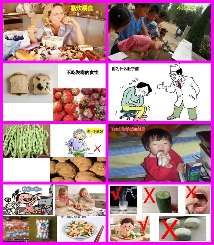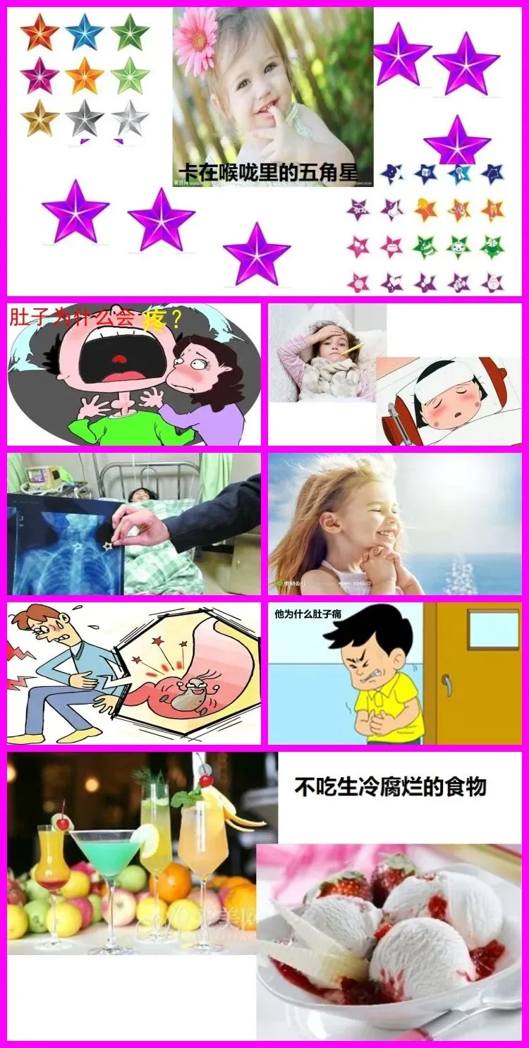 1.认知目标:知道异物(如五角星等小物件)卡喉的危险;了解生冷腐烂、发霉的食物不能吃,不喝生水,食物需煮熟后食用,避免暴饮暴食,明白这些行为与肚子痛的关联。