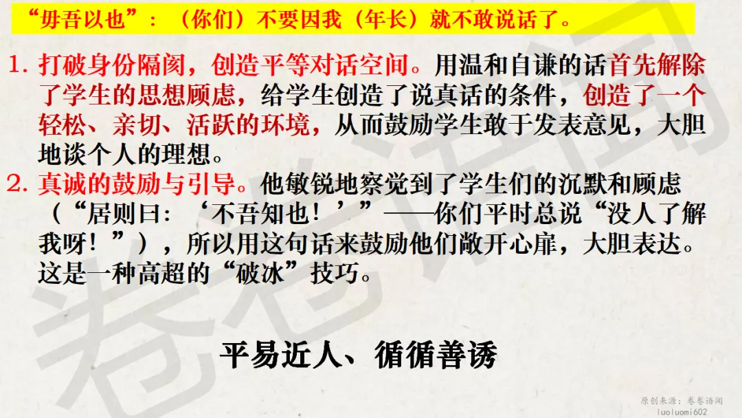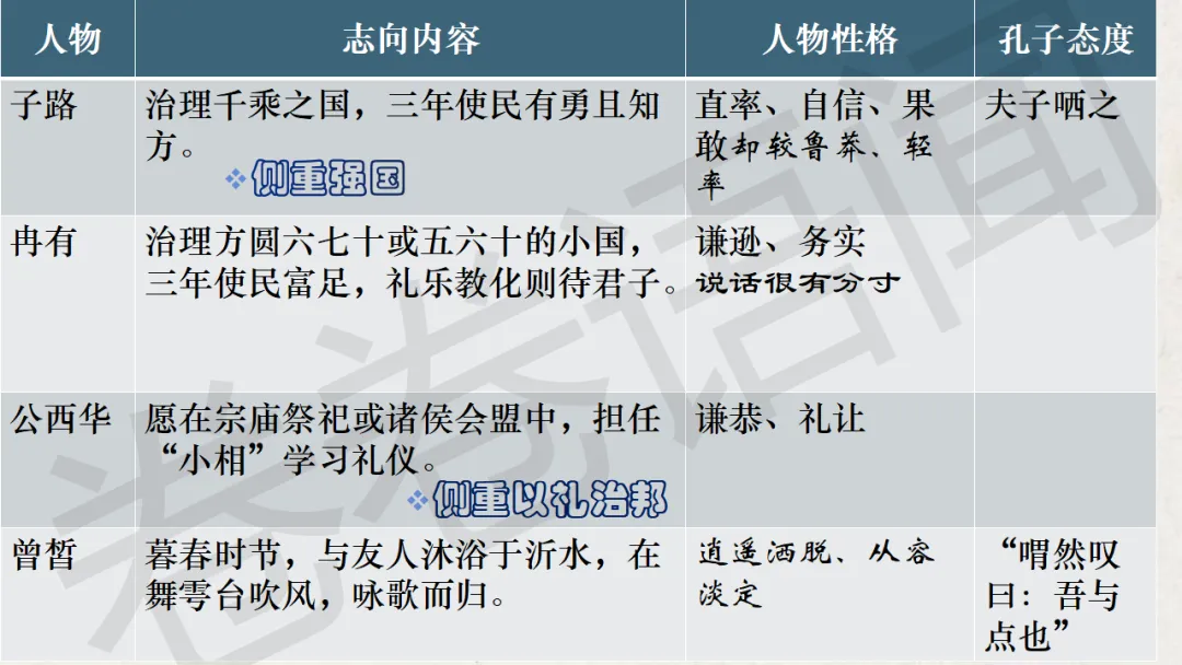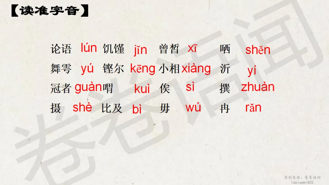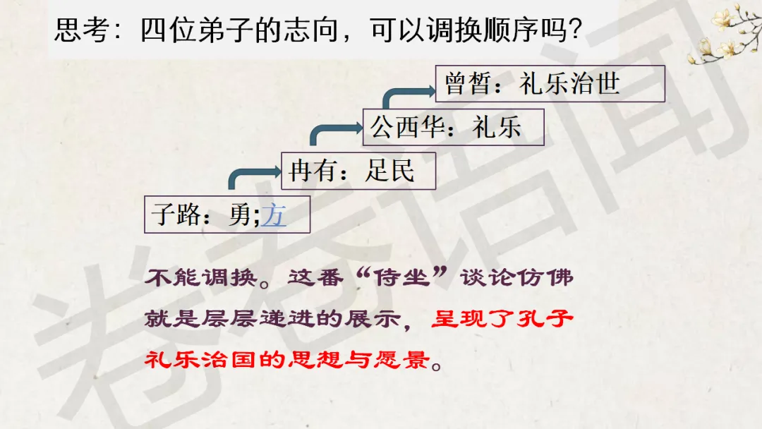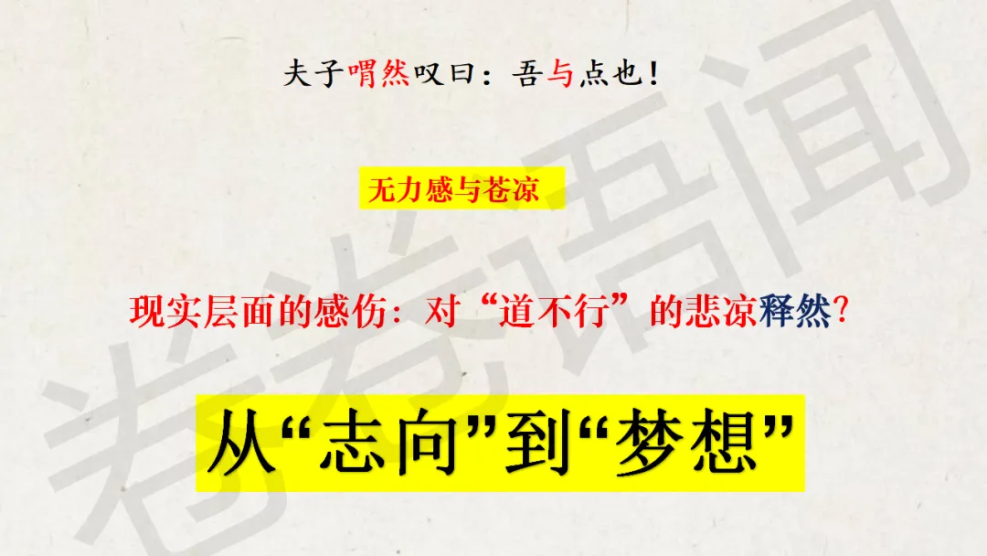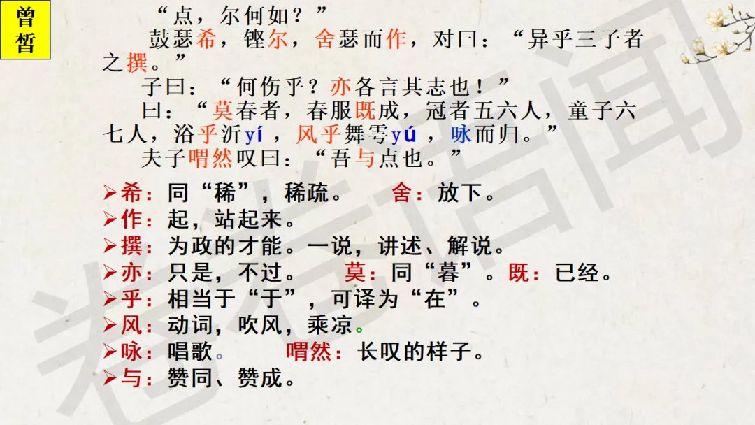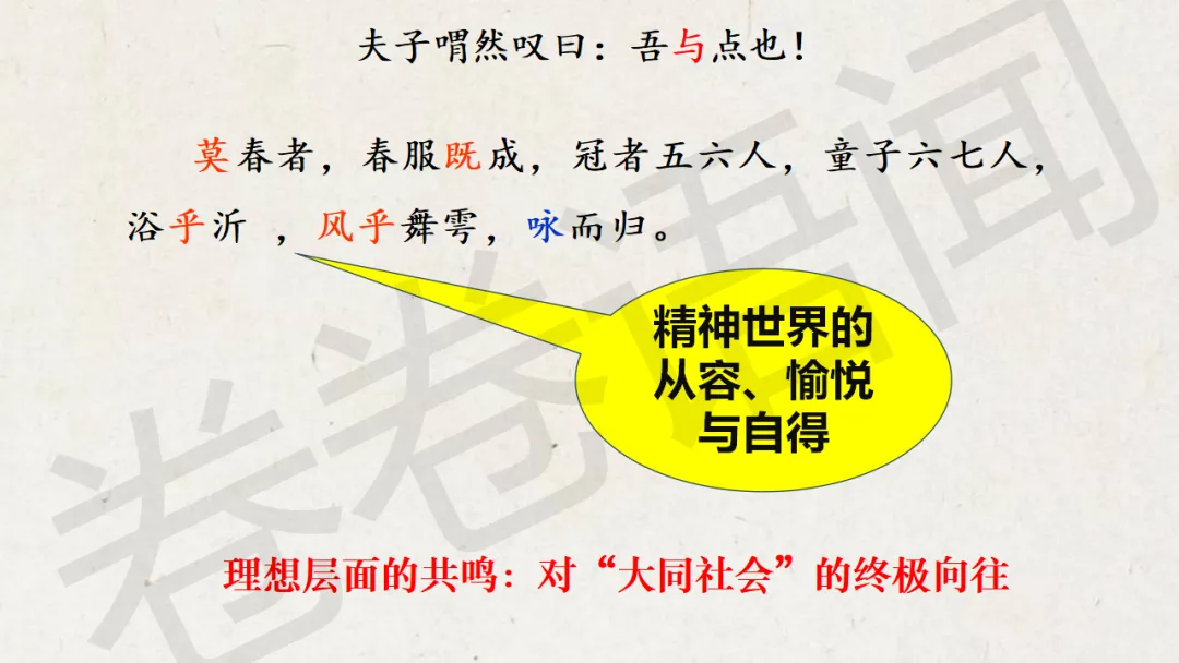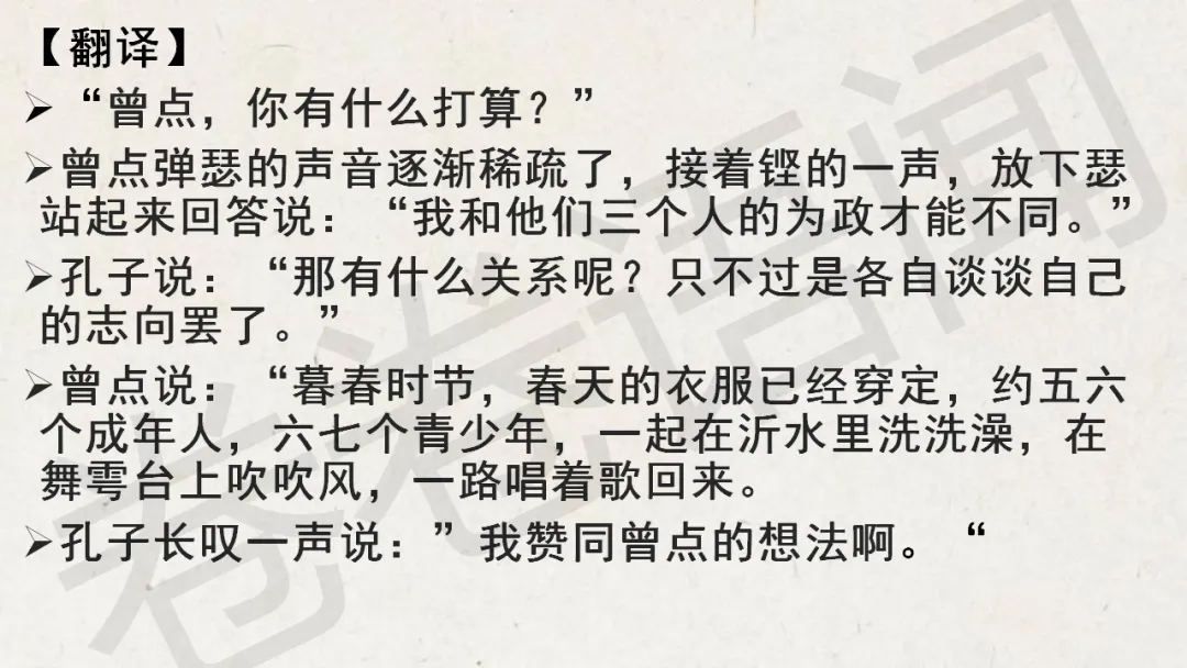 原来,在《论语》选读那本书里,这一章的名字叫“沂水春风”,我更喜欢这个“沂水春风”,充满诗意,这是属于孔子的理想,一个遥不可及的美好的梦想……