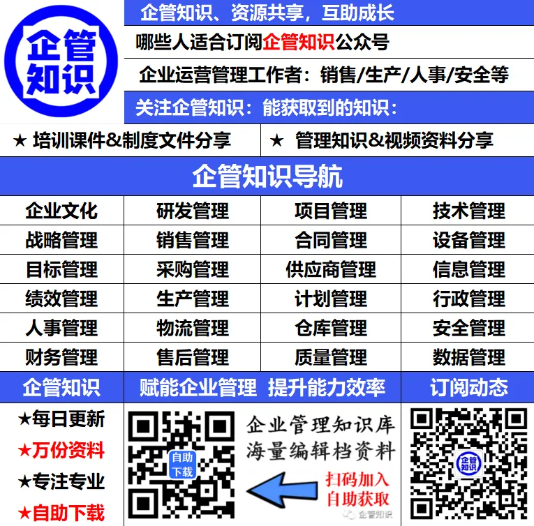 企管知识:专注于企业管理知识的分享!分享内容包括:经营管理职业健康安全管理(文档及视频)、销售管理、人力资源管理、生产管理、采购及供应商管理、财务管理、设备管理等等资料!企管知识共享资料,自助下载教程!