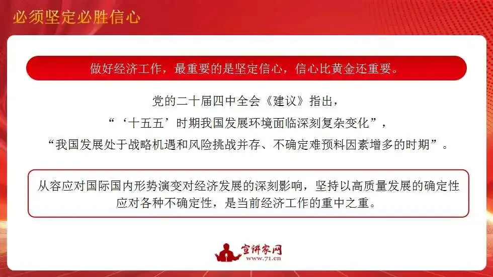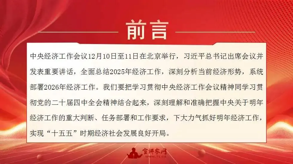 中央经济工作会议12月10日至11日在北京举行。本期课件紧扣会议核心要义,从必须坚定必胜信心、必须用好显著优势、必须坚持因地制宜三个维度,系统阐释了做好2026年经济工作的重要遵循,深刻阐明了以高质量发展的确定性应对各种不确定性的实践路径。