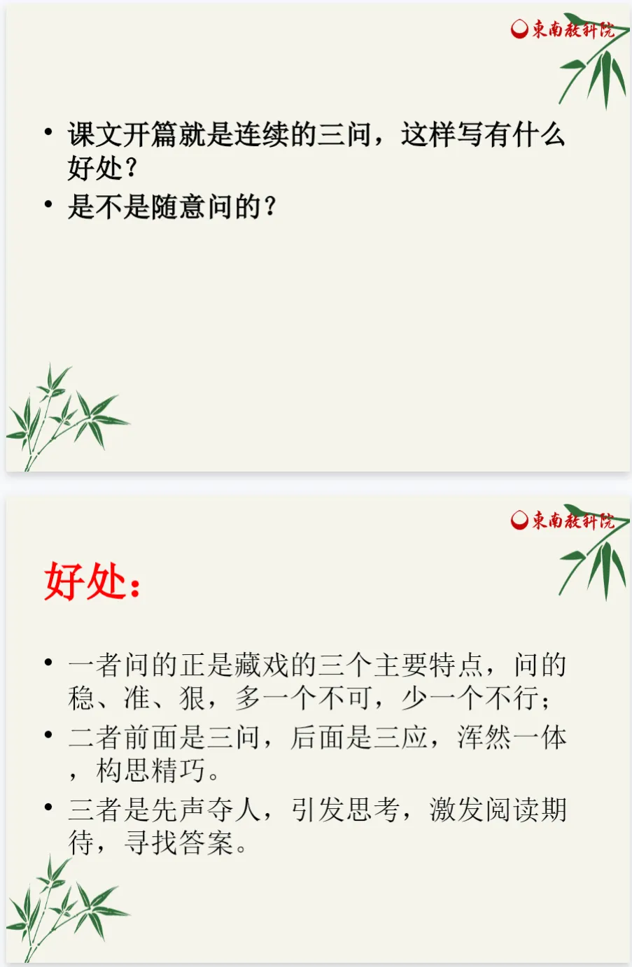 (不是,一者问的正是藏戏的三个主要特点,问的稳、准、狠,多一个不可,少一个不行;二者前面是三问,后面是三应,浑然一体,构思精巧。三者是先声夺人,引发思考,激发阅读期待,寻找答案。)