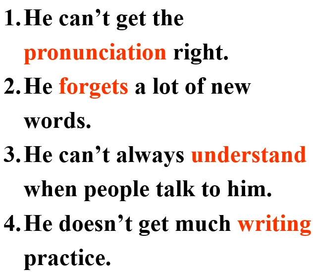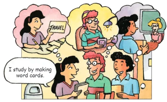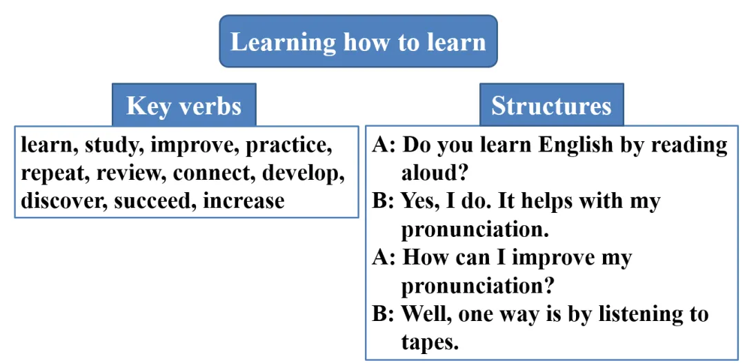 2. 熟练运用以下短语:make word cards, read the textbook, listen to tapes, ask the teacher for help, study for a test, work with a group, have conversations with, read aloud, practice pronunciation, spoken English