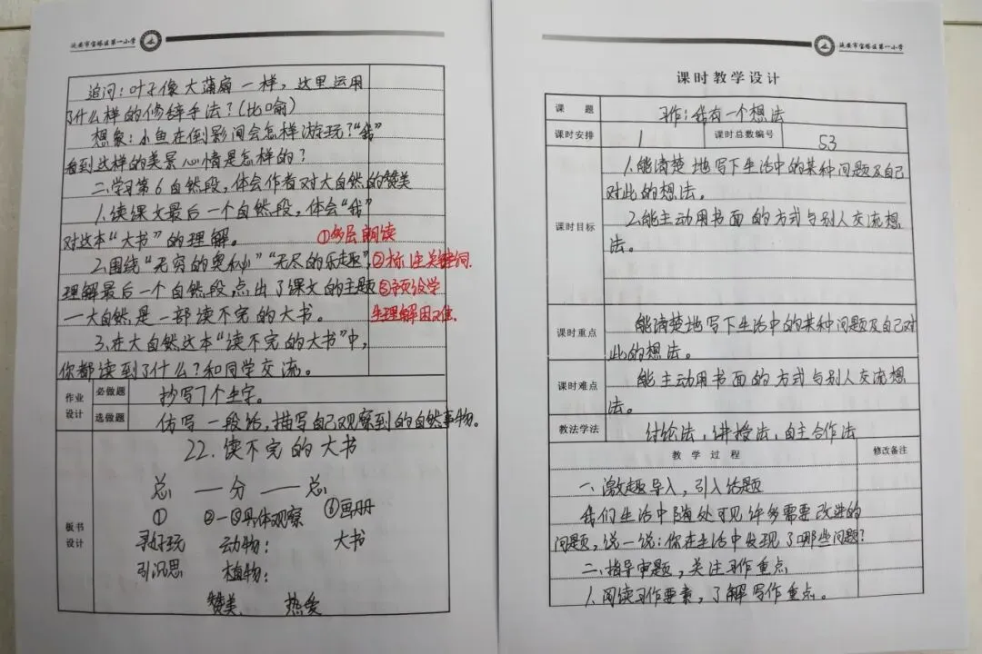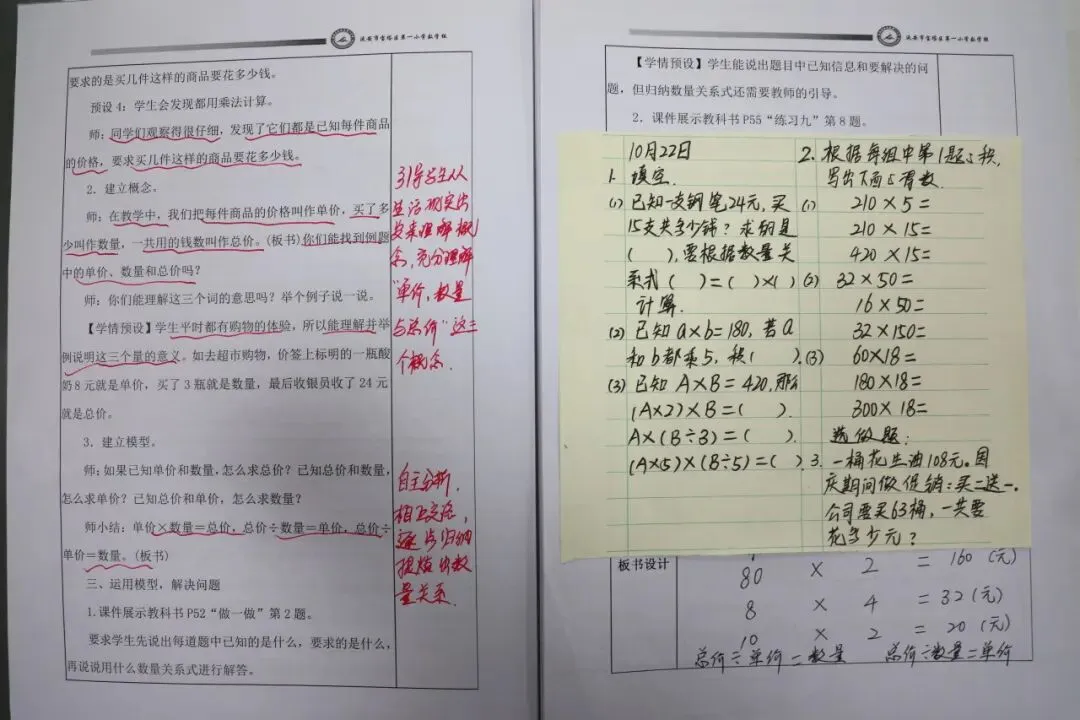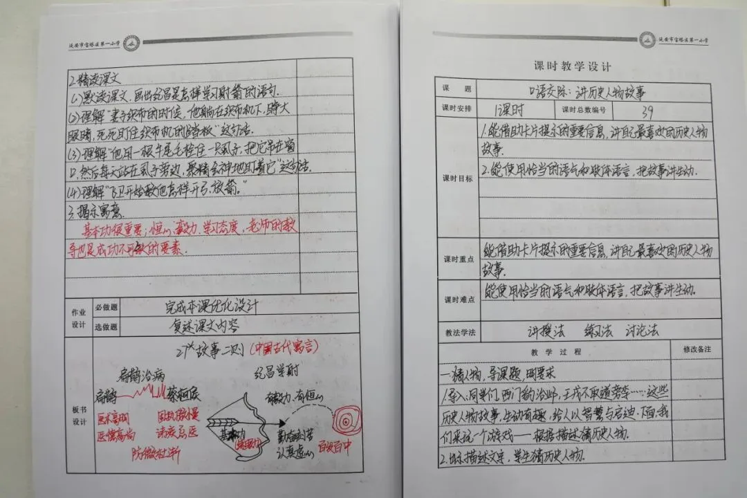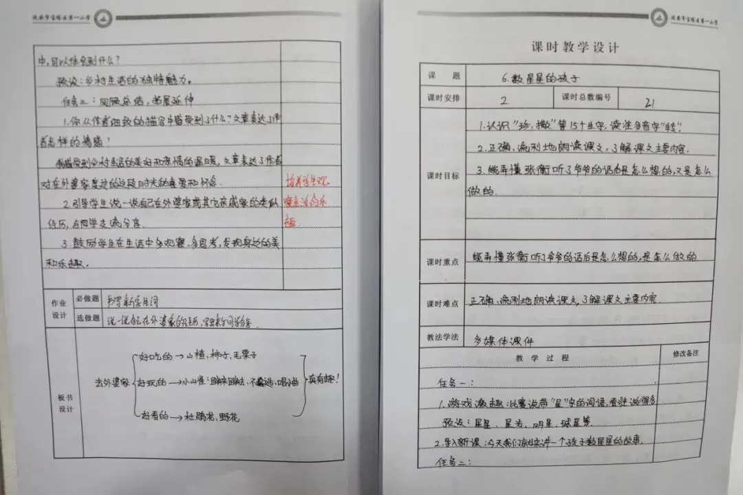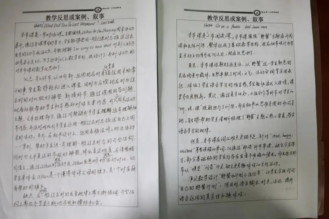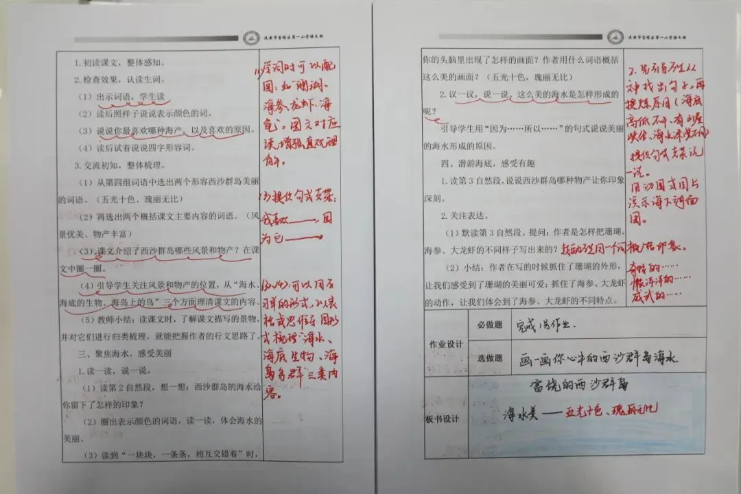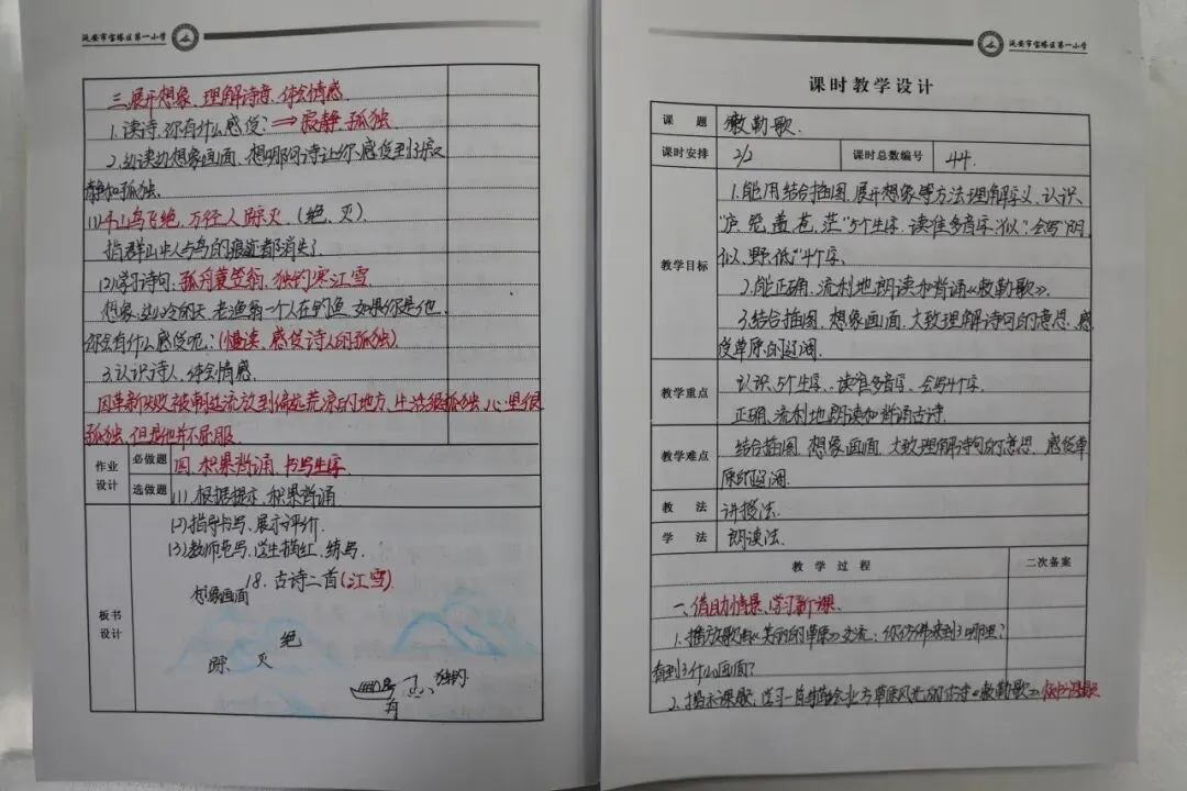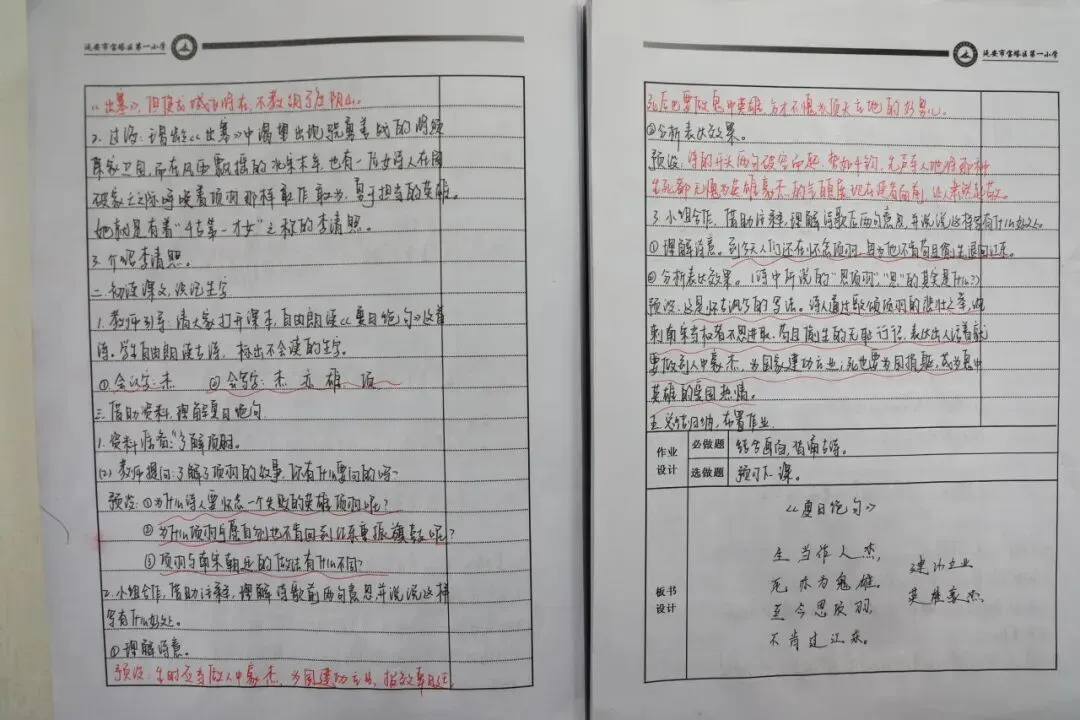 教案上工整的字迹体现了老师们认真严谨的态度,细致的标注蕴含着老师们思考探索的精神,详细的课后反思展现出老师们教学的严谨。
