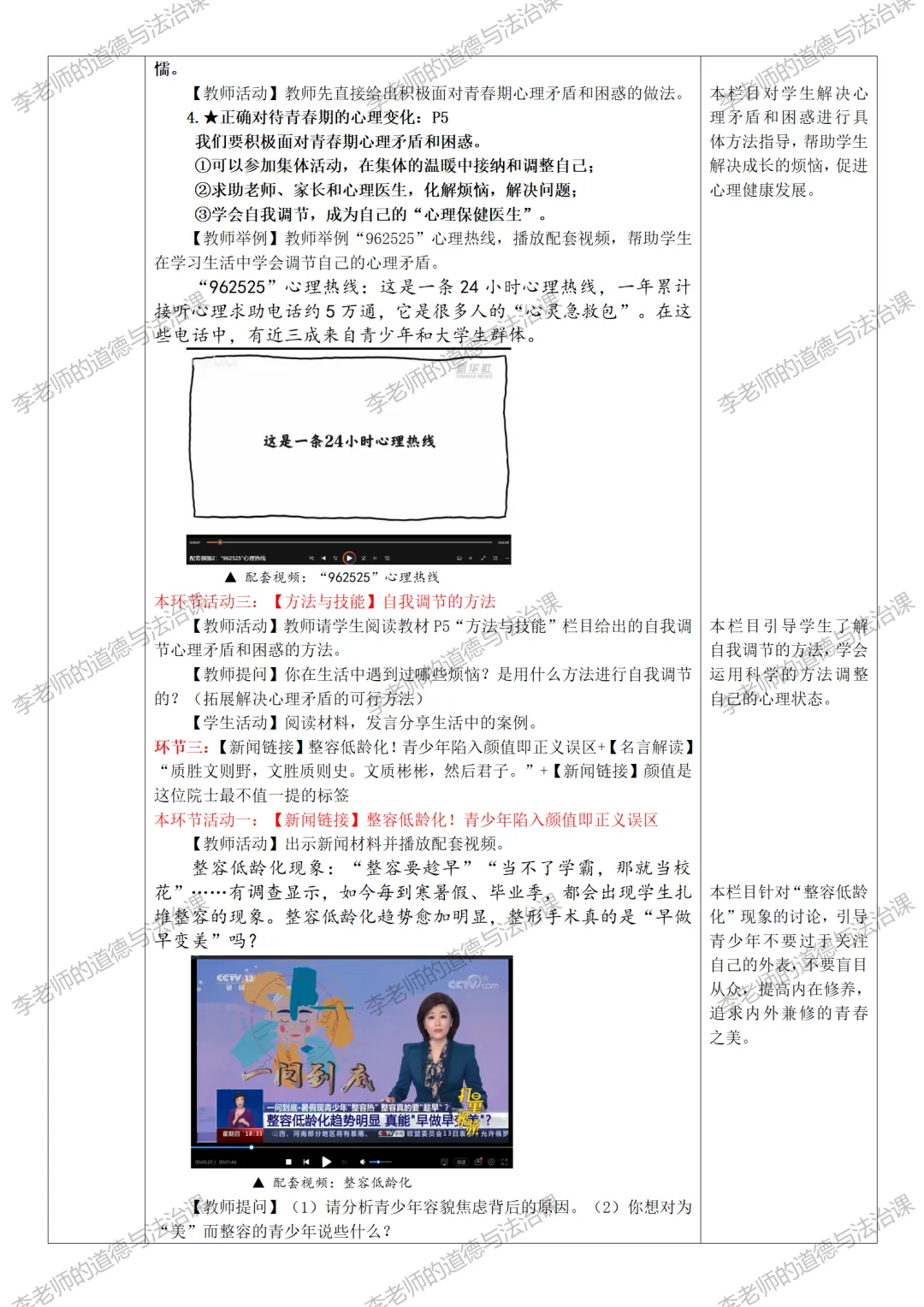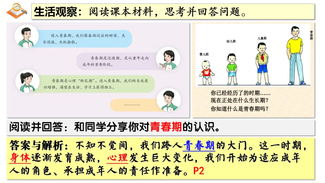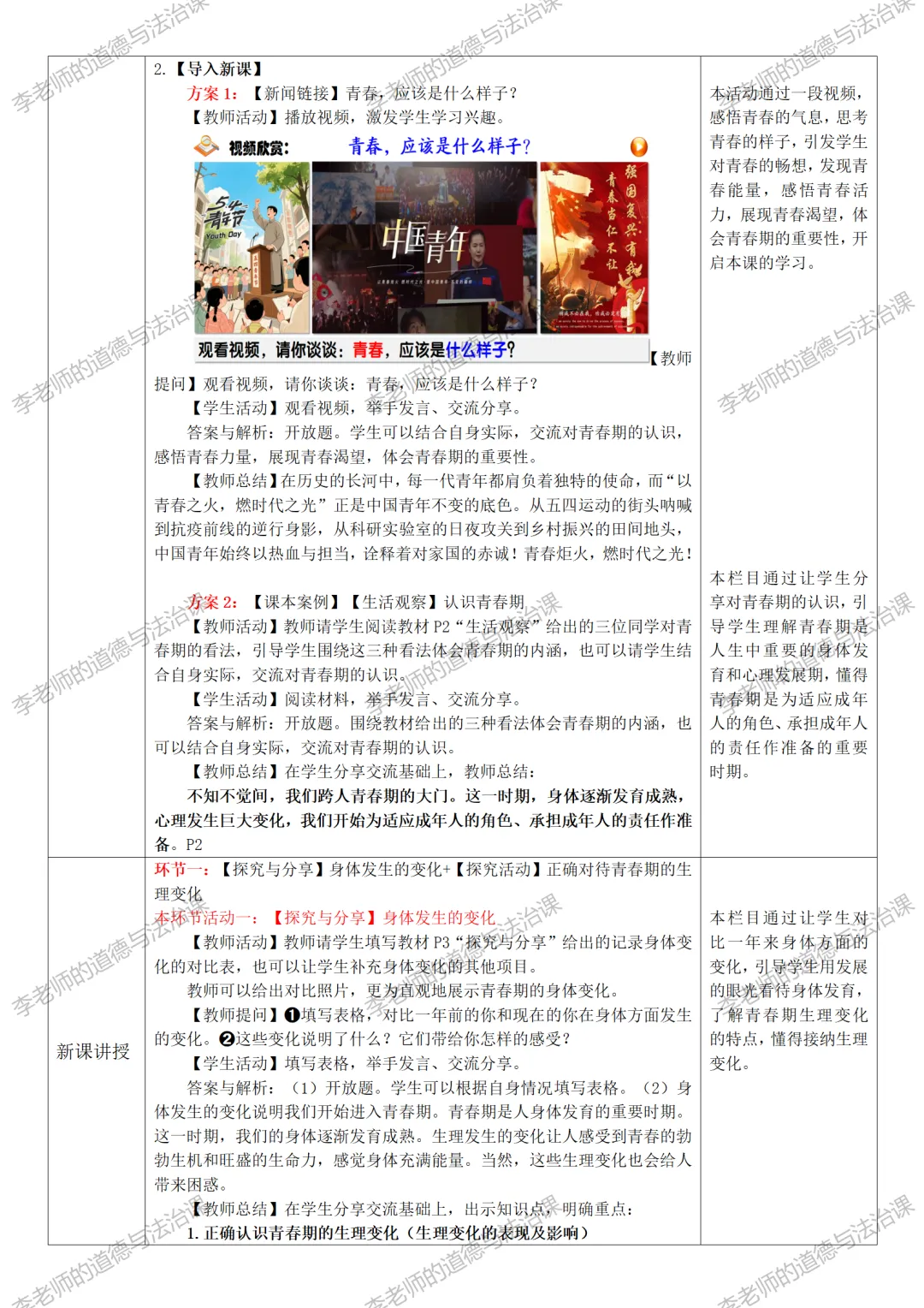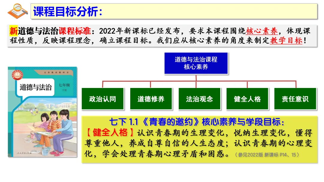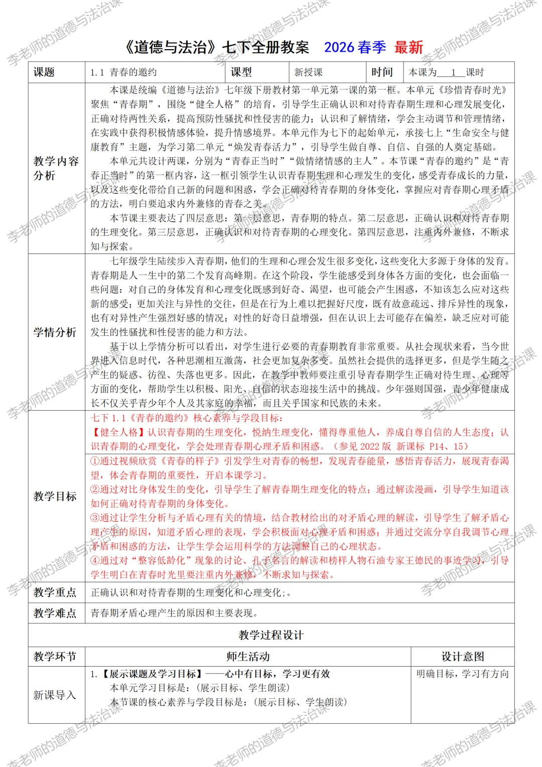 ▲2026春季,《道德与法治》七下教材沿用2025春季新版教材,教材基本未改动。本套教材强调核心素材的目标。为整个初中阶段道德与法治课程的开端,本单元对学生即将展开的初中生活进行了系统阐述,是教材建构的逻辑起点,具有统领全套教材的意义。▲本课在设计时通过视频欣赏《青春的样子》引发学生对青春的畅想,发现青春能量,感悟青春活力,展现青春渴望,体会青春期的重要性,开启本课学习。通过对比身体发生的变化,引导学生了解青春期生理变化的特点;通过让学生分析与矛盾心理有关的情境,结合教材给出的对矛盾心理的解读,引导学生了解矛盾心理产生的原因,知道矛盾心理的表现,学会积极面对心理矛盾和困惑;