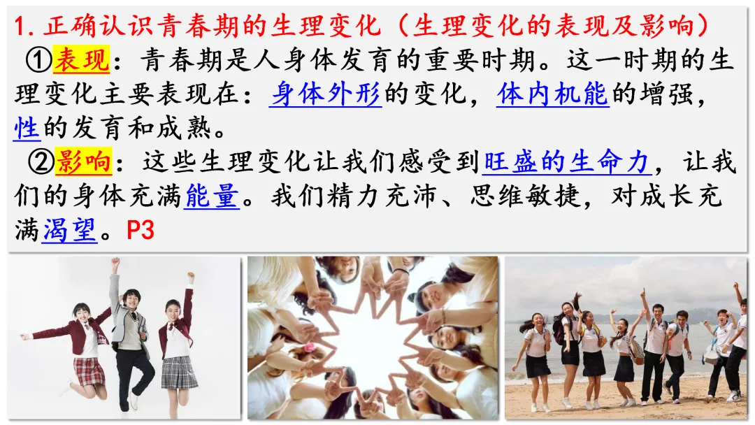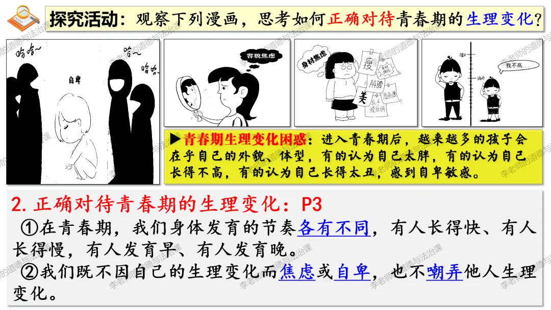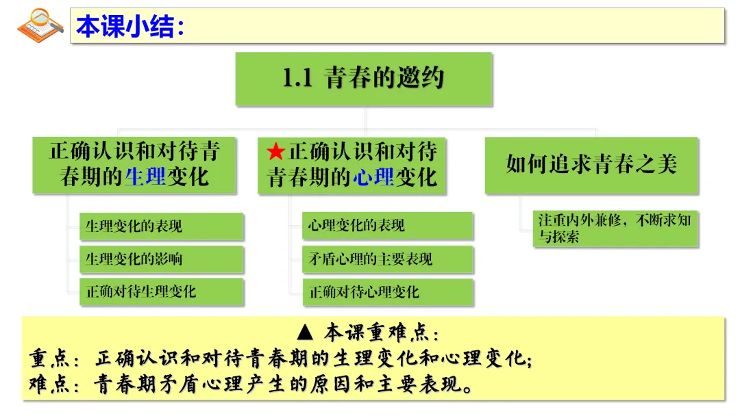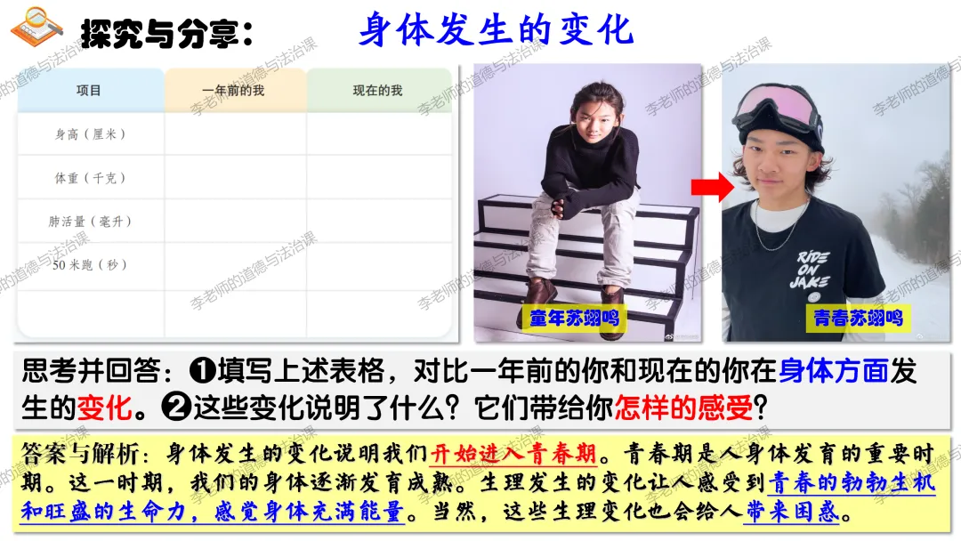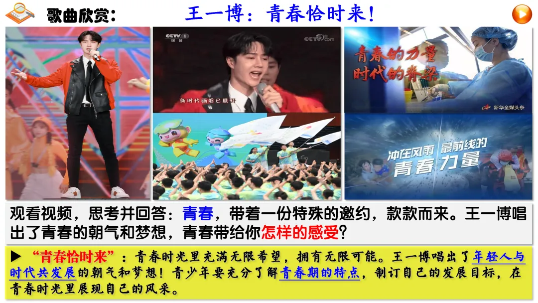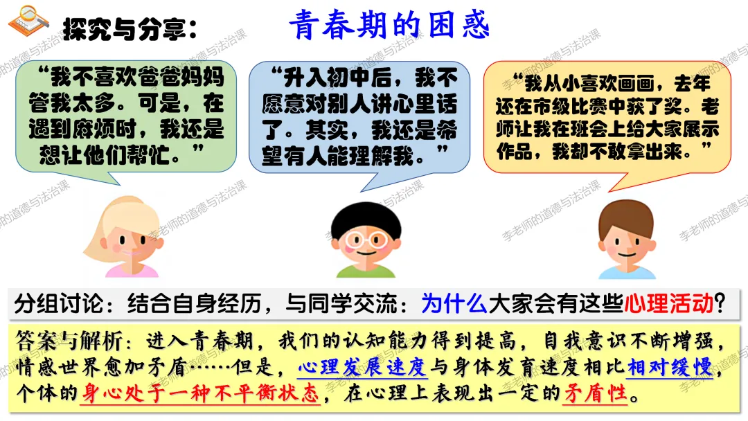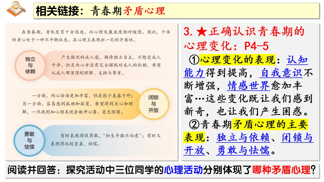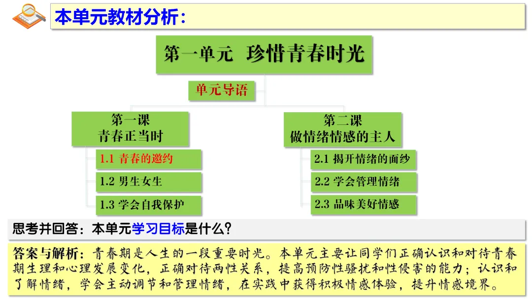 ▲2026春季,《道德与法治》七下教材沿用2025春季新版教材,教材基本未改动。本套教材强调核心素材的目标。为整个初中阶段道德与法治课程的开端,本单元对学生即将展开的初中生活进行了系统阐述,是教材建构的逻辑起点,具有统领全套教材的意义。▲本课在设计时通过视频欣赏《青春的样子》引发学生对青春的畅想,发现青春能量,感悟青春活力,展现青春渴望,体会青春期的重要性,开启本课学习。通过对比身体发生的变化,引导学生了解青春期生理变化的特点;通过让学生分析与矛盾心理有关的情境,结合教材给出的对矛盾心理的解读,引导学生了解矛盾心理产生的原因,知道矛盾心理的表现,学会积极面对心理矛盾和困惑;