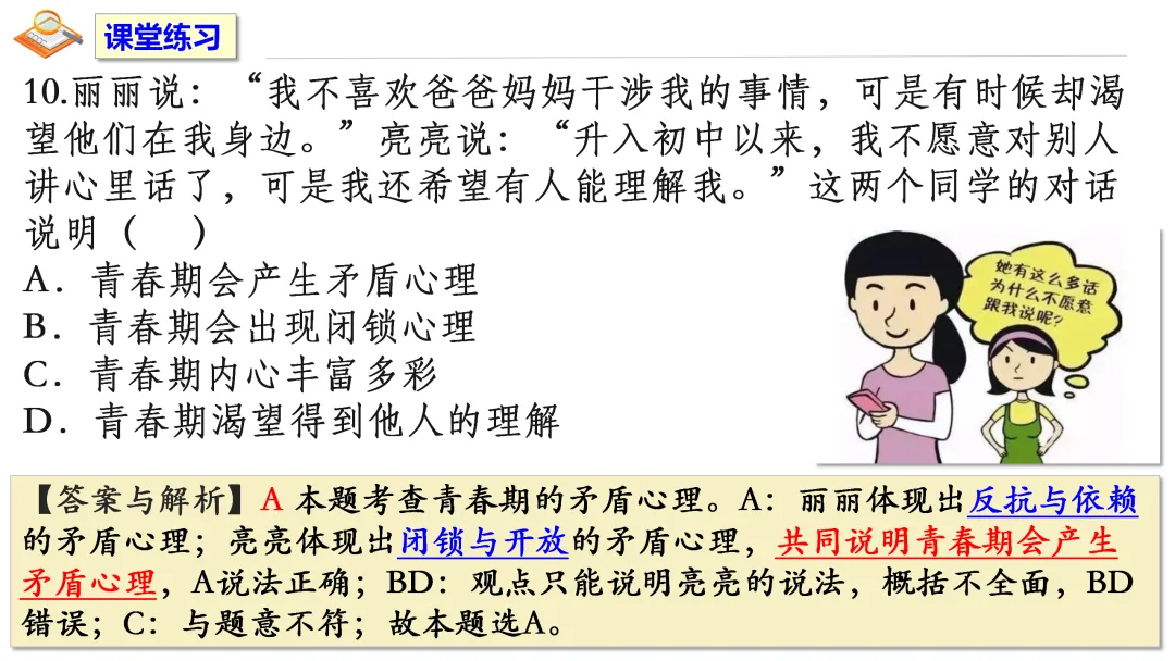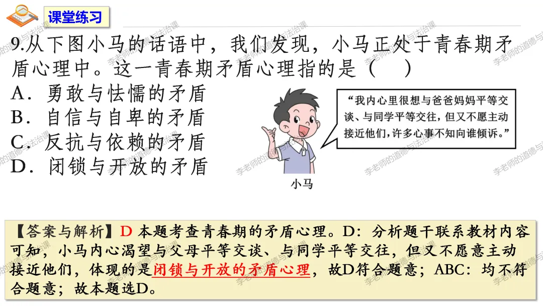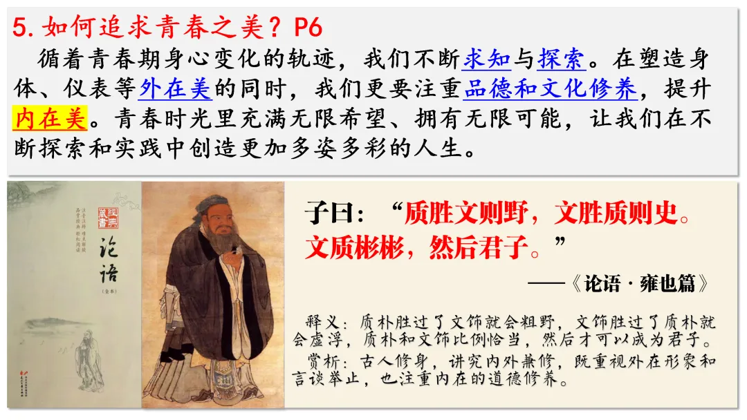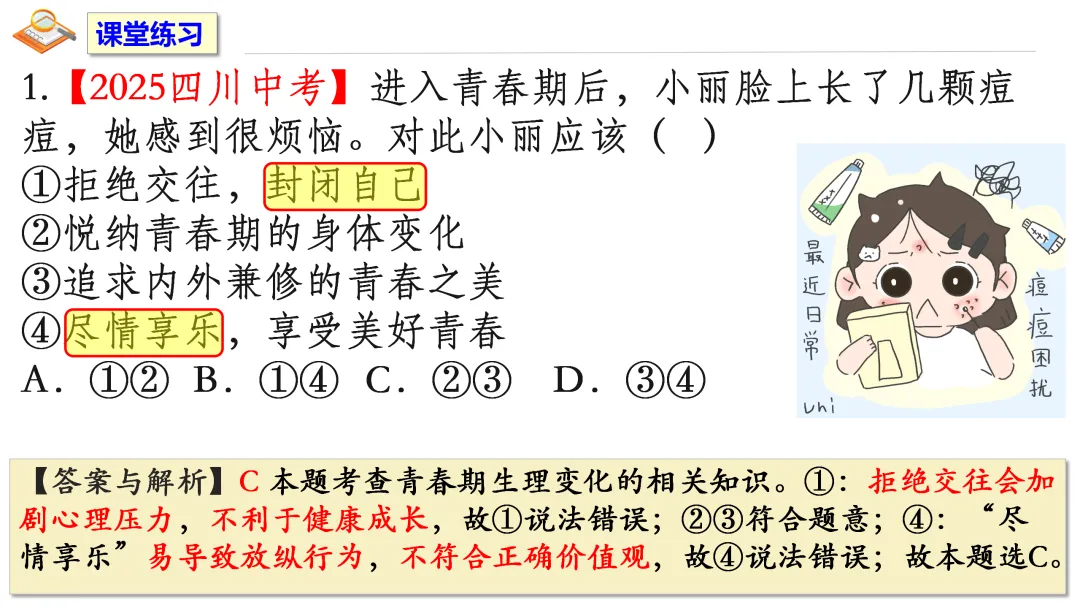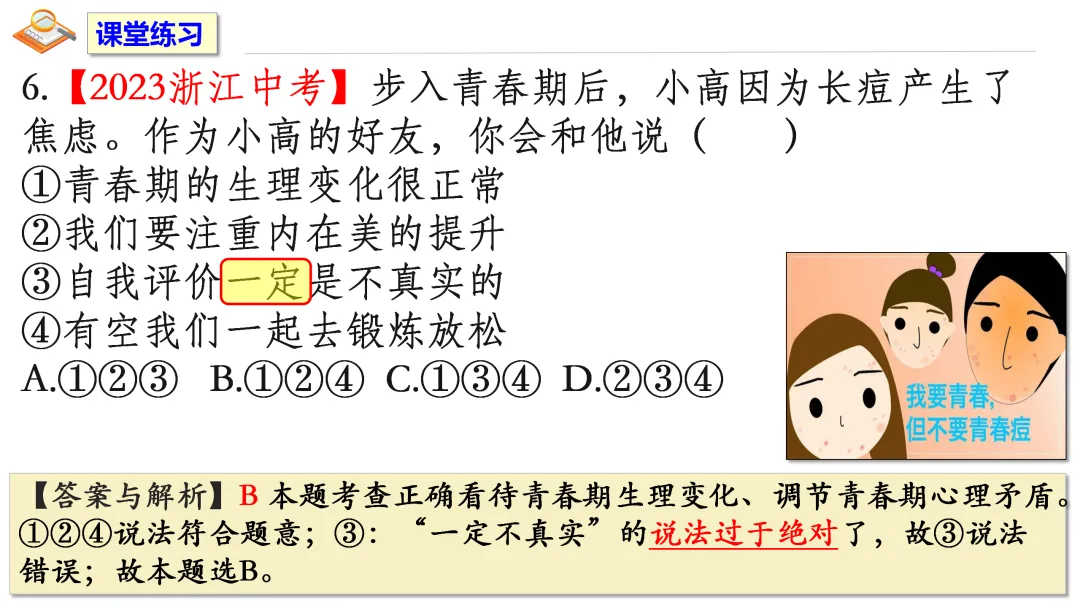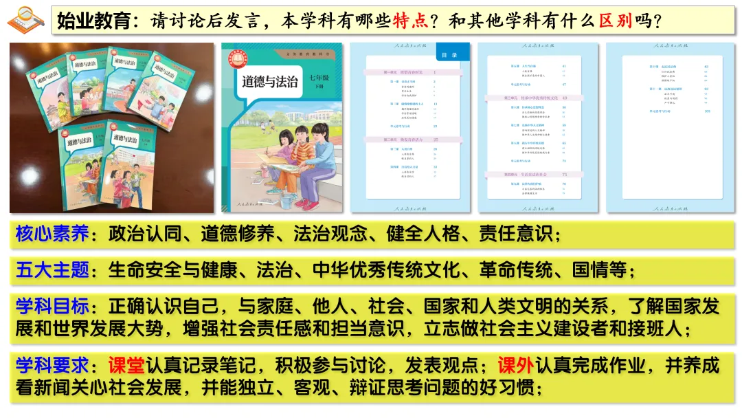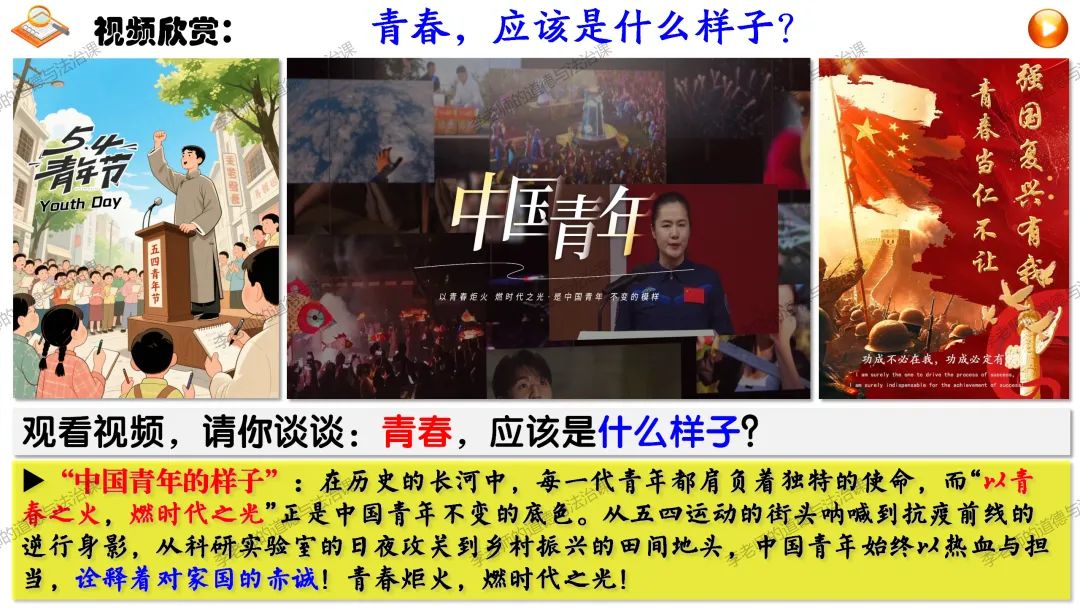 ▲2026春季,《道德与法治》七下教材沿用2025春季新版教材,教材基本未改动。本套教材强调核心素材的目标。为整个初中阶段道德与法治课程的开端,本单元对学生即将展开的初中生活进行了系统阐述,是教材建构的逻辑起点,具有统领全套教材的意义。▲本课在设计时通过视频欣赏《青春的样子》引发学生对青春的畅想,发现青春能量,感悟青春活力,展现青春渴望,体会青春期的重要性,开启本课学习。通过对比身体发生的变化,引导学生了解青春期生理变化的特点;通过让学生分析与矛盾心理有关的情境,结合教材给出的对矛盾心理的解读,引导学生了解矛盾心理产生的原因,知道矛盾心理的表现,学会积极面对心理矛盾和困惑;
