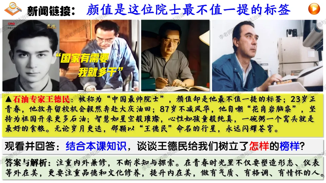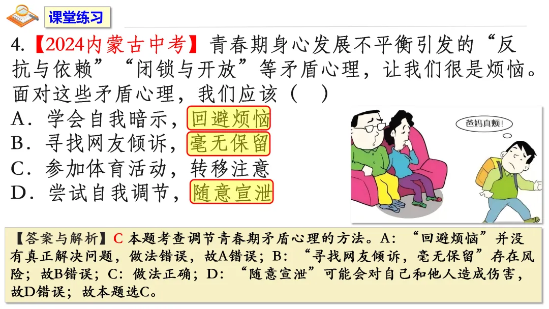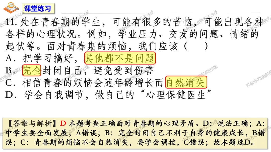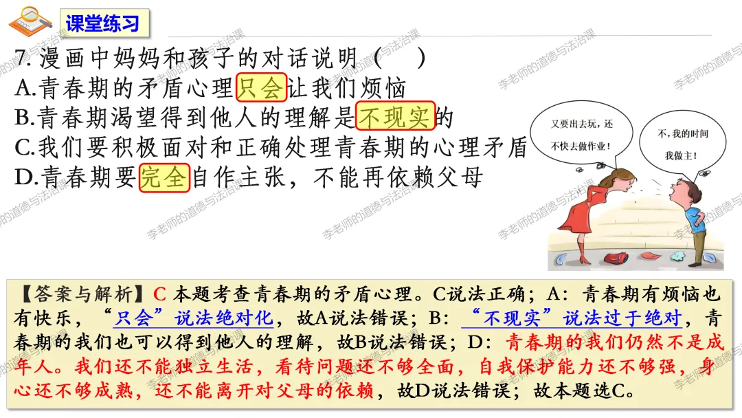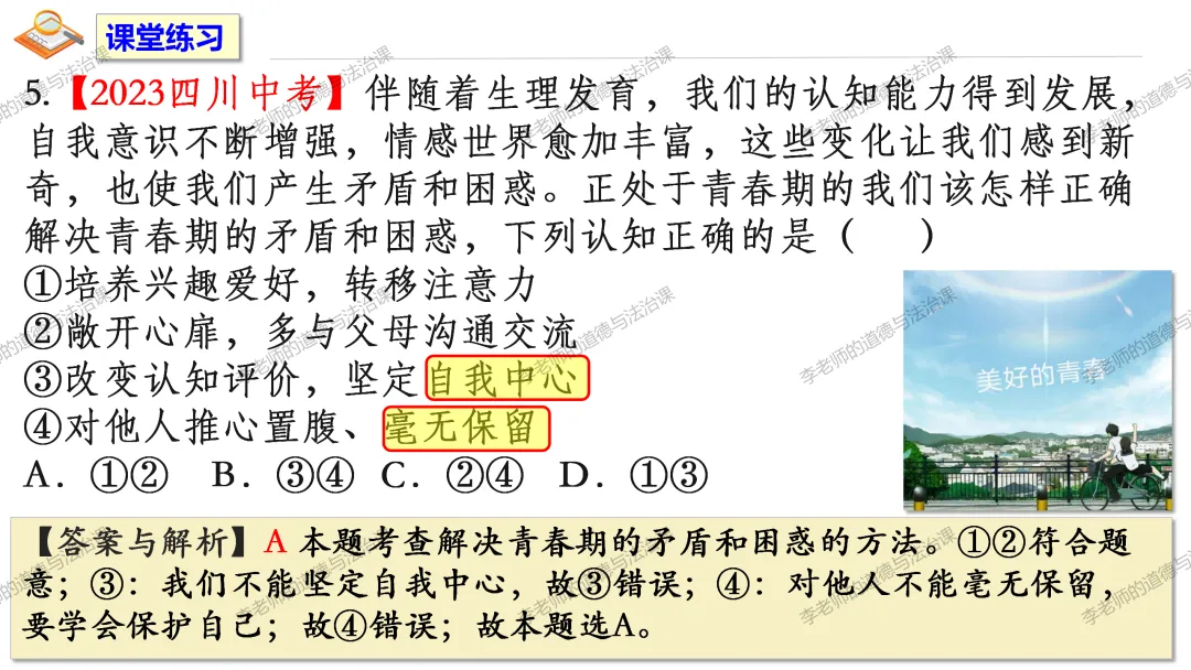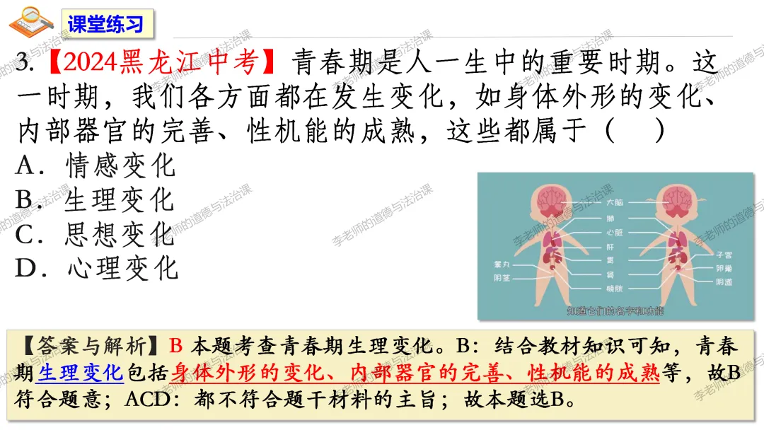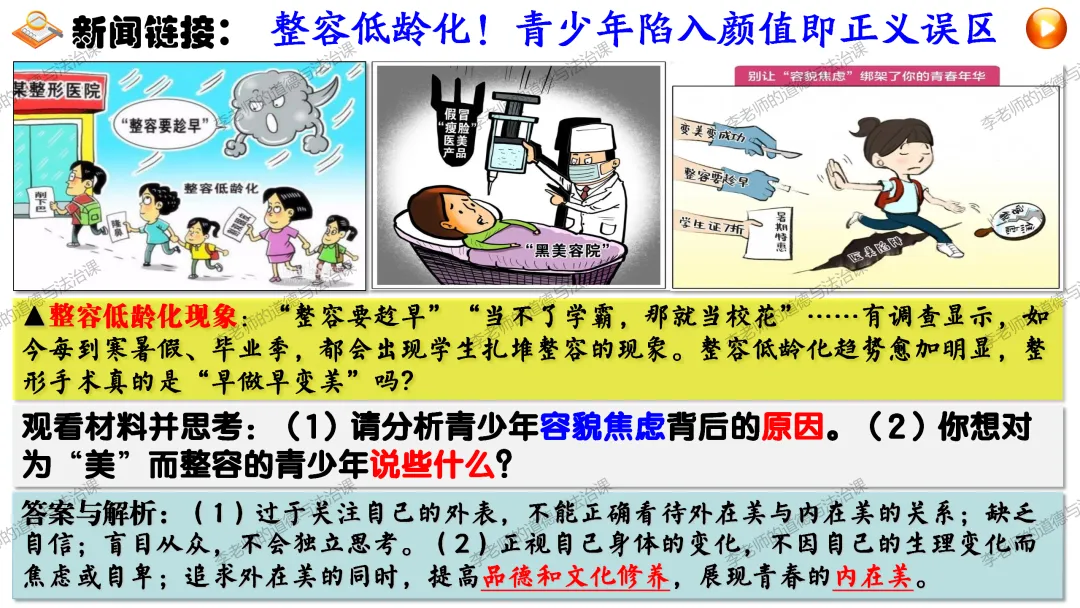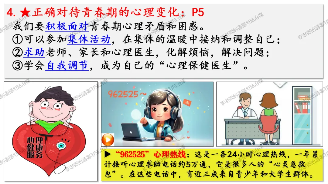 ▲2026春季,《道德与法治》七下教材沿用2025春季新版教材,教材基本未改动。本套教材强调核心素材的目标。为整个初中阶段道德与法治课程的开端,本单元对学生即将展开的初中生活进行了系统阐述,是教材建构的逻辑起点,具有统领全套教材的意义。▲本课在设计时通过视频欣赏《青春的样子》引发学生对青春的畅想,发现青春能量,感悟青春活力,展现青春渴望,体会青春期的重要性,开启本课学习。通过对比身体发生的变化,引导学生了解青春期生理变化的特点;通过让学生分析与矛盾心理有关的情境,结合教材给出的对矛盾心理的解读,引导学生了解矛盾心理产生的原因,知道矛盾心理的表现,学会积极面对心理矛盾和困惑;