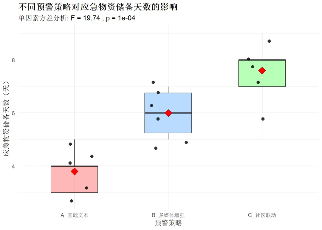# 加载必要的包library(ggplot2)library(dplyr)# 创建数据框strategy_data <- data.frame( strategy = factor(rep(c("A_基础文本", "B_多媒体增强", "C_社区联动"), times = c(5, 6, 5))), days = c(3, 4, 5, 4, 3, # 策略A5, 6, 7, 5, 7, 6, # 策略B7, 8, 6, 9, 8) # 策略C)# 单因素方差分析anova_result <- aov(days ~ strategy, data = strategy_data)# 单因素方差分析结果print(summary(anova_result))## Df Sum Sq Mean Sq F value Pr(>F) ## strategy 2 36.44 18.219 19.74 0.000115 ***## Residuals 13 12.00 0.923 ## ---## Signif. codes: 0 '***' 0.001 '**' 0.01 '*' 0.05 '.' 0.1 ' ' 1# 事后检验tukey_result <- TukeyHSD(anova_result)print(tukey_result)## Tukey multiple comparisons of means## 95% family-wise confidence level## ## Fit: aov(formula = days ~ strategy, data = strategy_data)## ## $strategy## diff lwr upr p adj## B_多媒体增强-A_基础文本 2.2 0.66386108 3.736139 0.0060223## C_社区联动-A_基础文本 3.8 2.19555523 5.404445 0.0000818## C_社区联动-B_多媒体增强 1.6 0.06386108 3.136139 0.0409620# 箱线图+均值点+显著性标记ggplot(strategy_data, aes(x = strategy, y = days, fill = strategy)) + geom_boxplot(alpha = 0.7, width = 0.5) + geom_jitter(width = 0.2, size = 2, alpha = 0.8) + stat_summary(fun = mean, geom = "point", shape = 23, size = 4, fill = "red", color = "black") + labs(title = "不同预警策略对应急物资储备天数的影响", subtitle = paste("单因素方差分析: F =", round(summary(anova_result)[[1]][1, "F value"], 2),", p =", round(summary(anova_result)[[1]][1, "Pr(>F)"], 4)), x = "预警策略", y = "应急物资储备天数(天)") + scale_fill_manual(values = c("#FF9999", "#99CCFF", "#99FF99")) + theme_minimal() + theme(legend.position = "none", plot.title = element_text(face = "bold"))