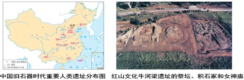通过教科书插图《早期人类主要遗址》和其他插图以及配套课件,还有相关解说视频,使学生认识早期中华文明所处的特定时代的社会经济、气候地形地貌等环境,培育学生时空观。