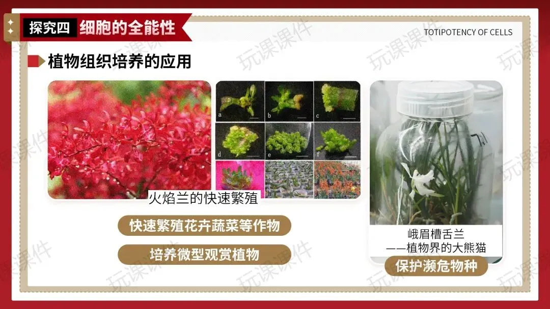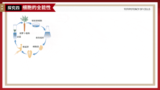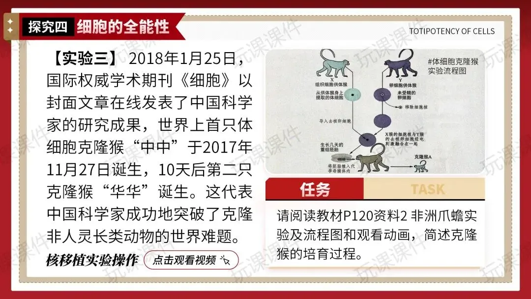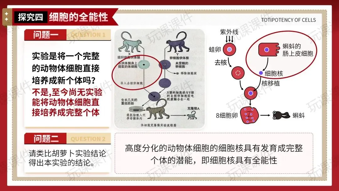 对“胡萝卜组织培养”和“克隆猴”等实验的分析并非简单告知结论,而是将其作为探究“细胞全能性”的证据来源,通过问题串引导学生分析实验,类比得出动物细胞核全能性概念。