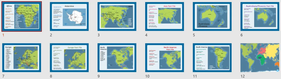 今天和大家分享分享一套有趣味性又有知识性的资料,七大洲、五大洋主题英语学习素材,包含:PPT+卡片+海报各一套、手工教具4套、视频5部及练习纸4套。