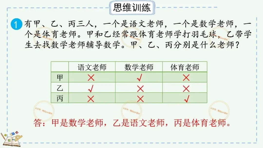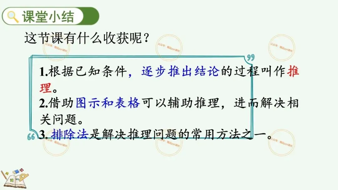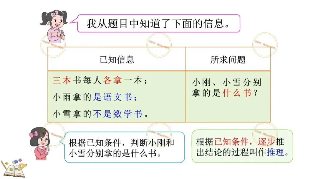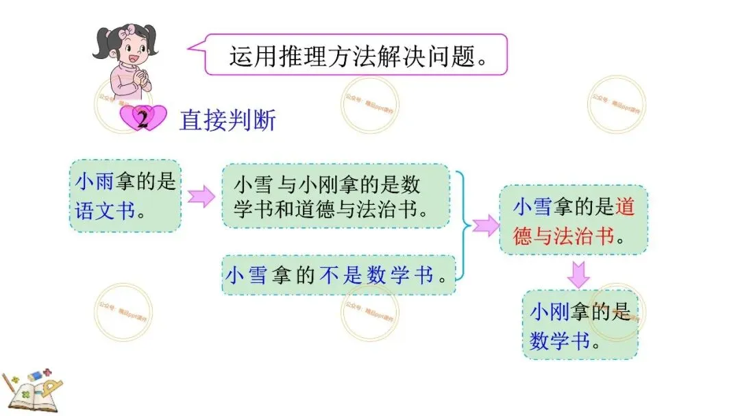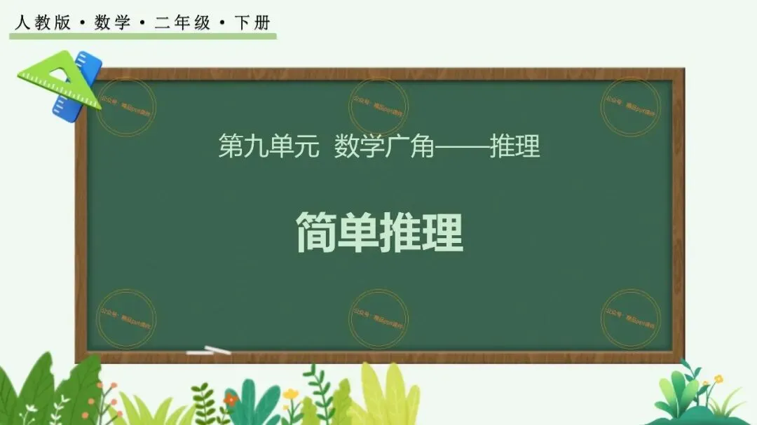 2、本公众号成立的初衷是为广大ppt使用者提升工作效率,所发布的课件资源仅供学习交流禁止用于商业用途,有偿所得用来维系公众号运营所支出的人工成本,性质为买家友情赞助后获取的信息差而非售卖资源的费用。同意此声明后即可下载本期小学二年级下册数学广角《9.1 简单的推理》ppt教学课件。如有侵犯您的权利,请联系小沐老师。