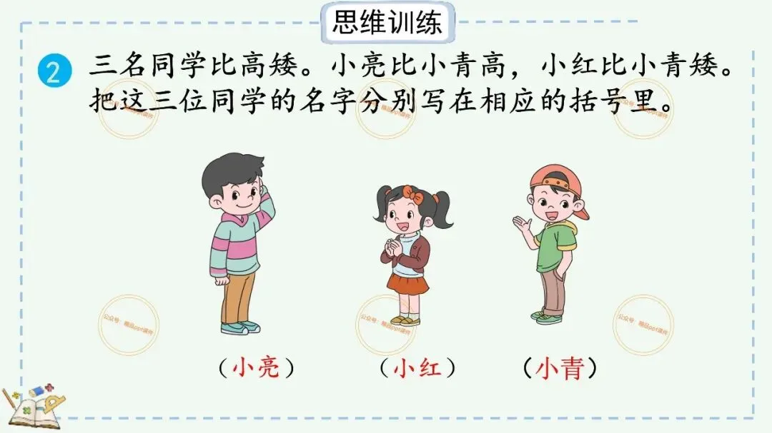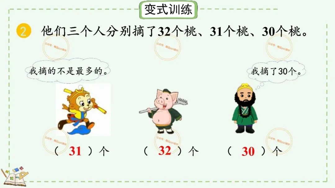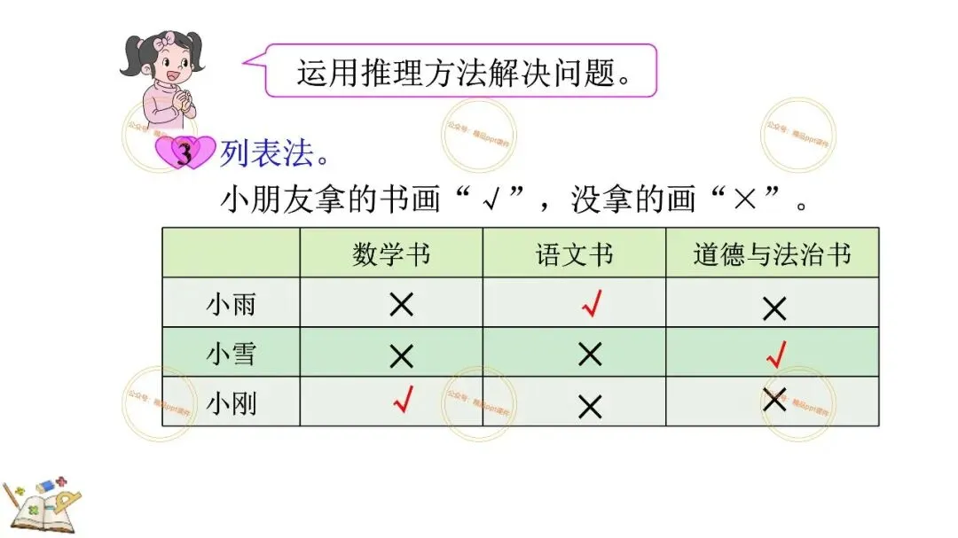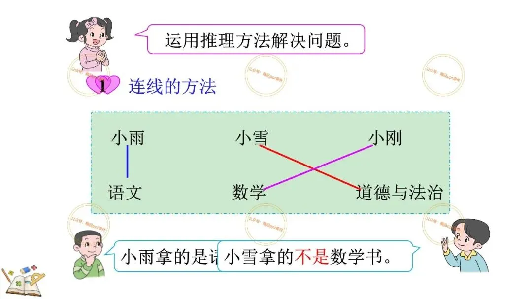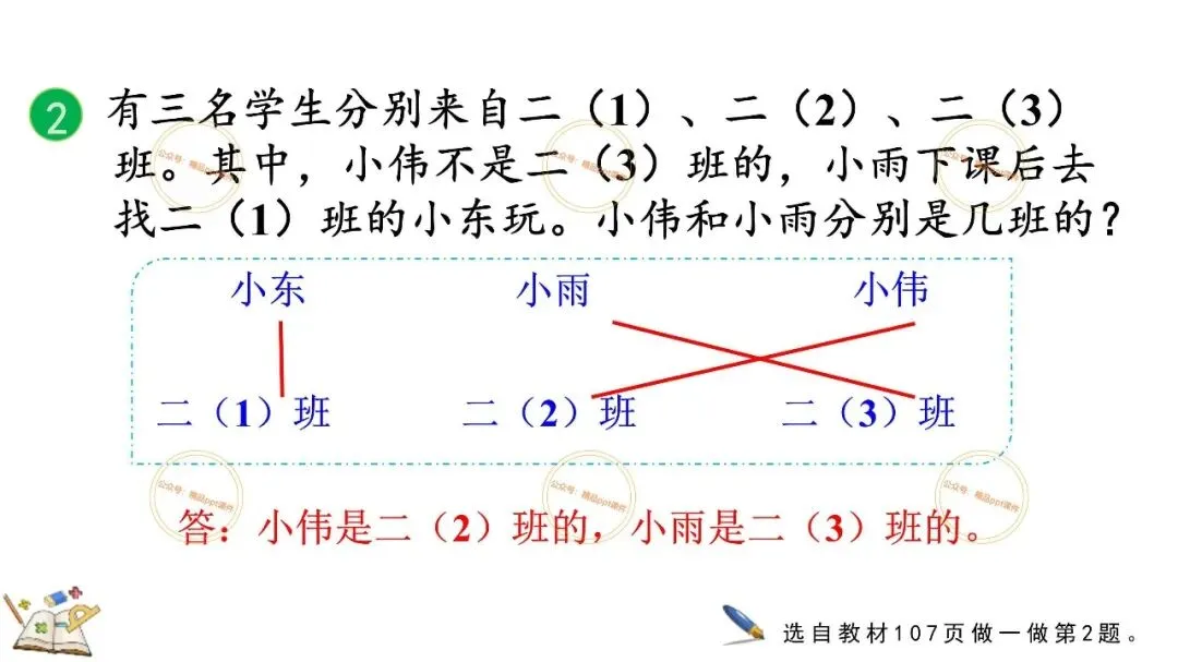 2、本公众号成立的初衷是为广大ppt使用者提升工作效率,所发布的课件资源仅供学习交流禁止用于商业用途,有偿所得用来维系公众号运营所支出的人工成本,性质为买家友情赞助后获取的信息差而非售卖资源的费用。同意此声明后即可下载本期小学二年级下册数学广角《9.1 简单的推理》ppt教学课件。如有侵犯您的权利,请联系小沐老师。