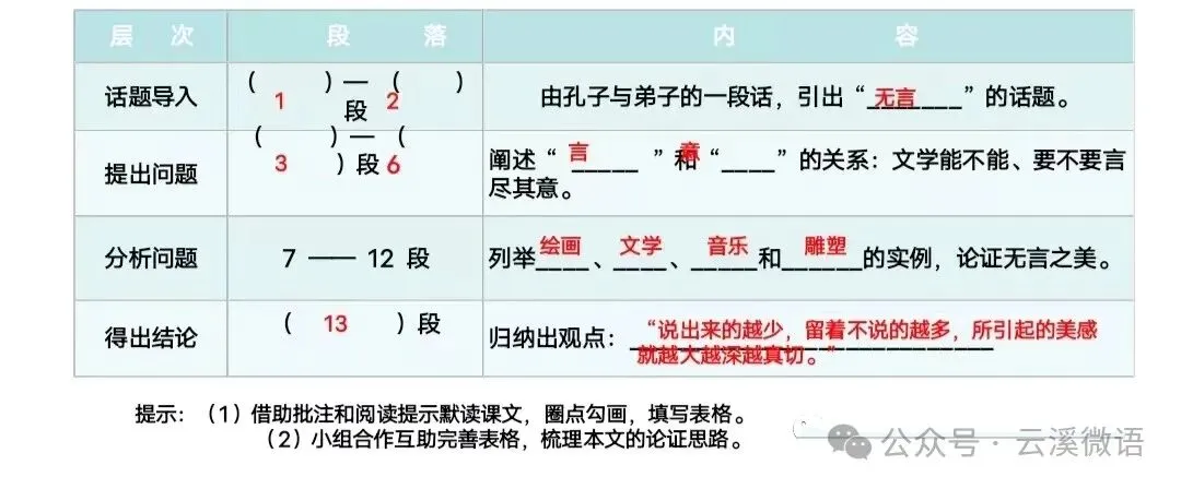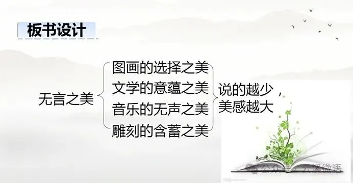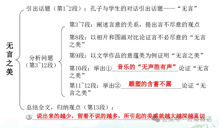 3.明确本文的中心论点: 说出来的越少,留着不说的越多,所引出的美感就越大越深越真切,这就是“无言之美”。