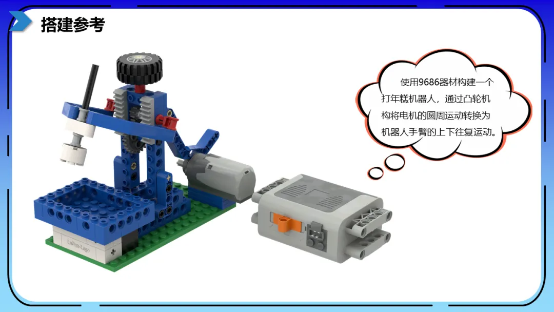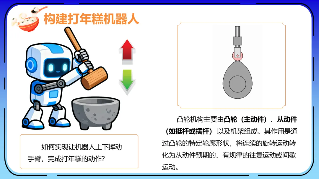课程的核心是学习并应用凸轮机构。孩子们通过亲手搭建,将电机的圆周运动转换为机器人手臂的上下捶打动作,成功构建出能模拟打年糕的机器人。这一过程不仅锻炼了他们的空间建构与动手能力,更让他们直观理解了“旋转运动转化为往复运动”这一核心机械原理。