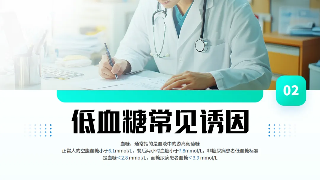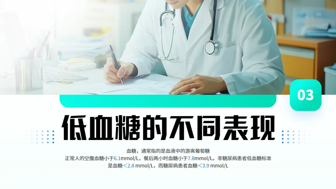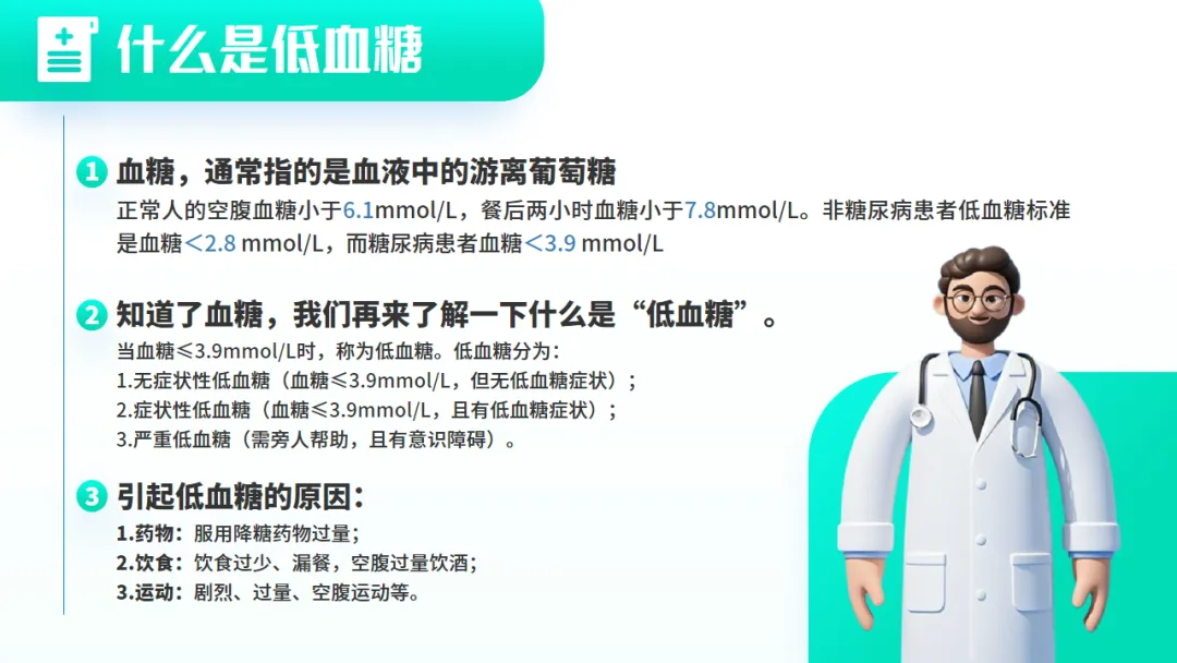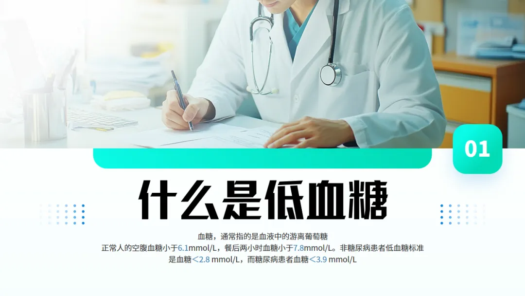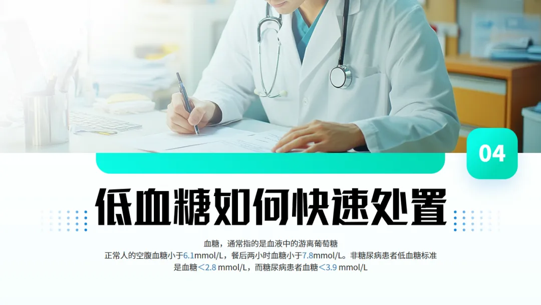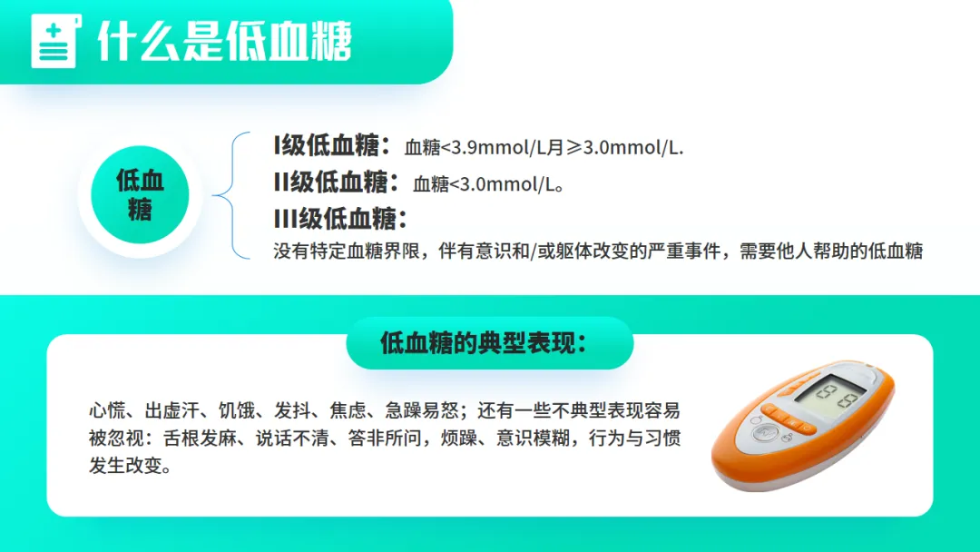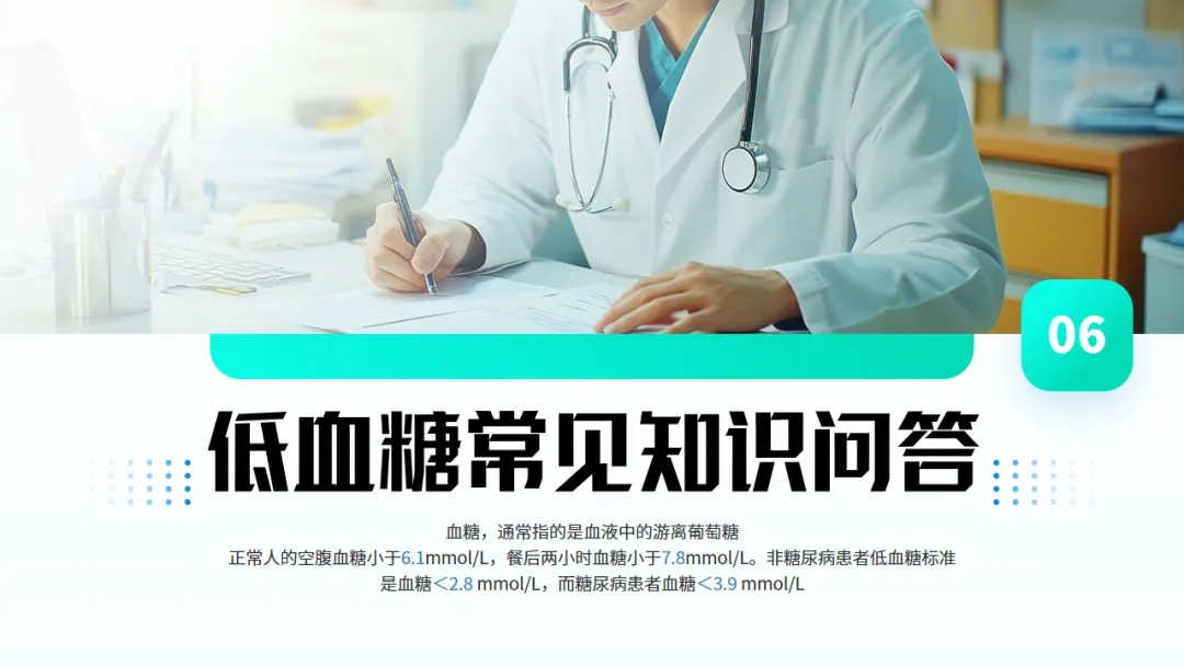 血糖,通常指的是血液中的游离葡萄糖。正常人的空腹血糖小于6.1mmol/L,餐后两小时血糖小于7.8mmol/L。非糖尿病患者低血糖标准是血糖<2.8 mmol/L,而糖尿病患者血糖<3.9 mmol/L