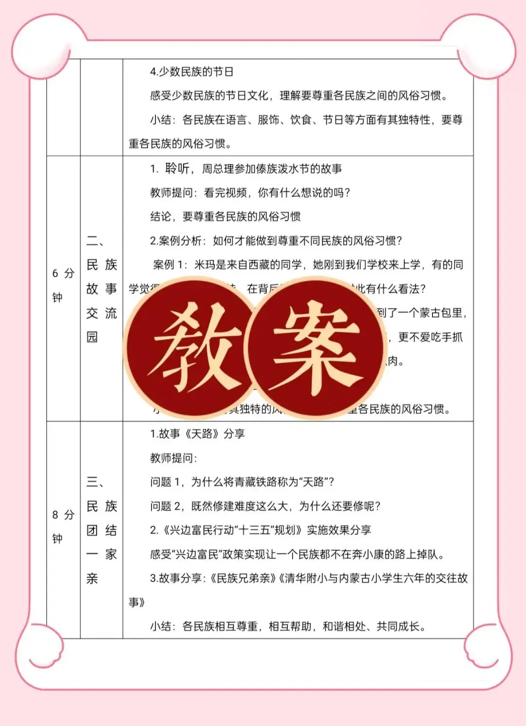 教学重点:感受各民族之间的相互交融、相互尊重、守望相助。