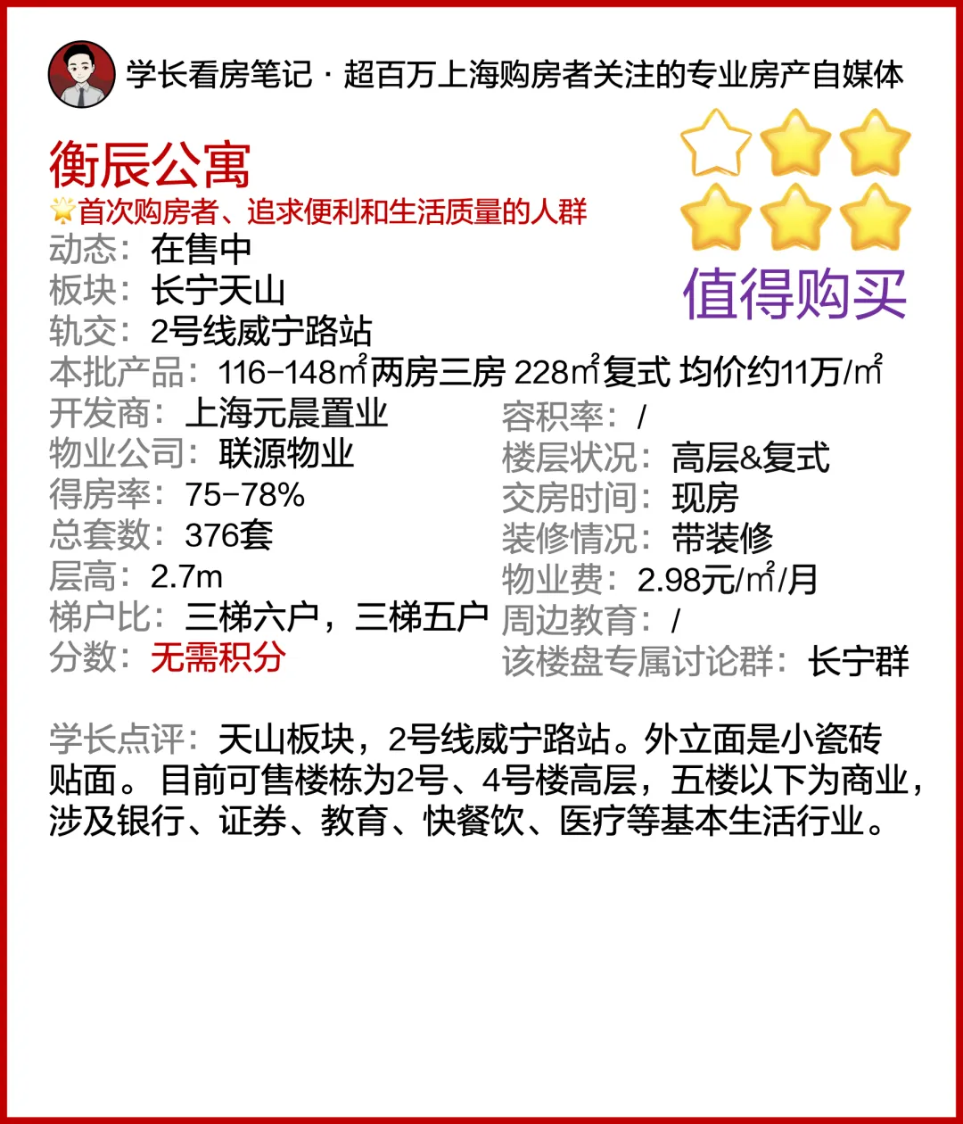 最新消息:长宁天山「衡辰公寓」正在热销中!推出建面约116-228㎡房源,总价780-1300万!