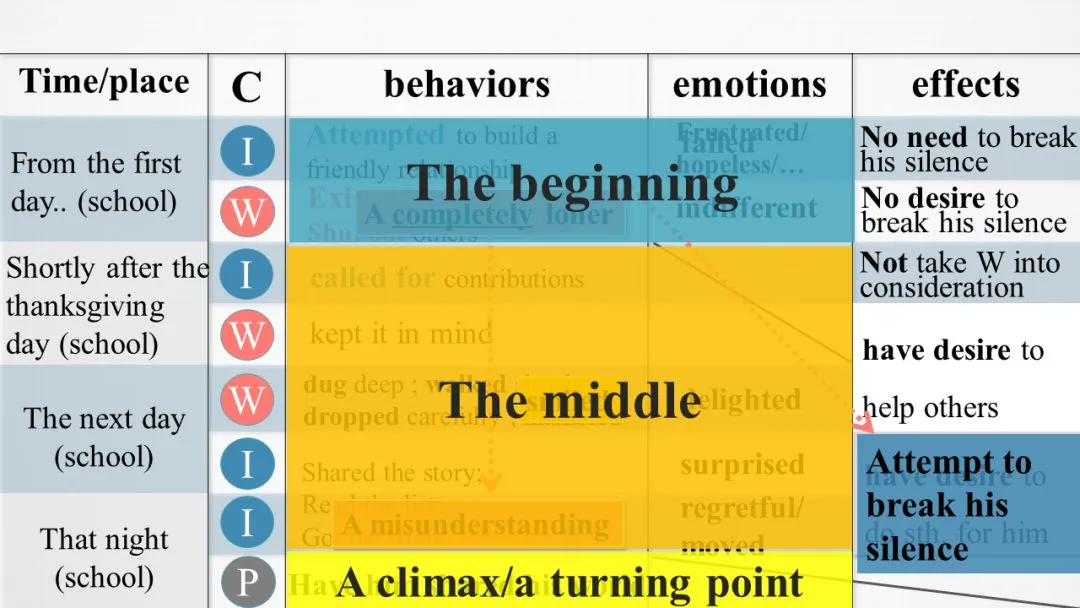 用表格的形式整理所给故事的发展脉络,以时间为线索串联起人物的行为和情绪变化。点明整个故事的转折点所在:老师对Willard保持与世隔绝的安静是有误解的,因此老师下定决心真正走进Willard安静的世界并再次尝试打破Willard的极度安静。