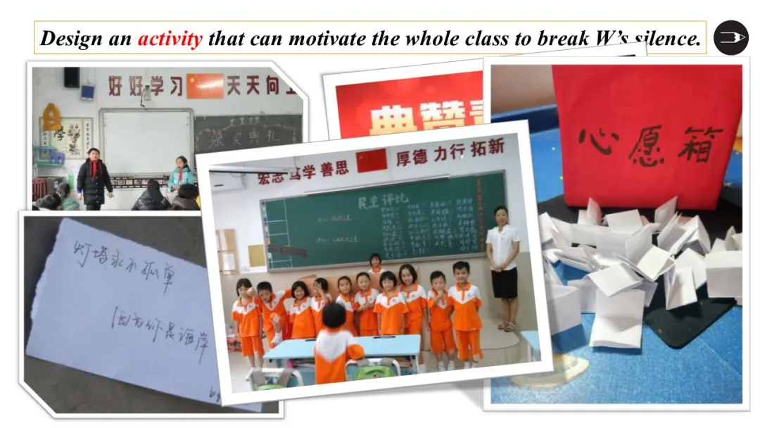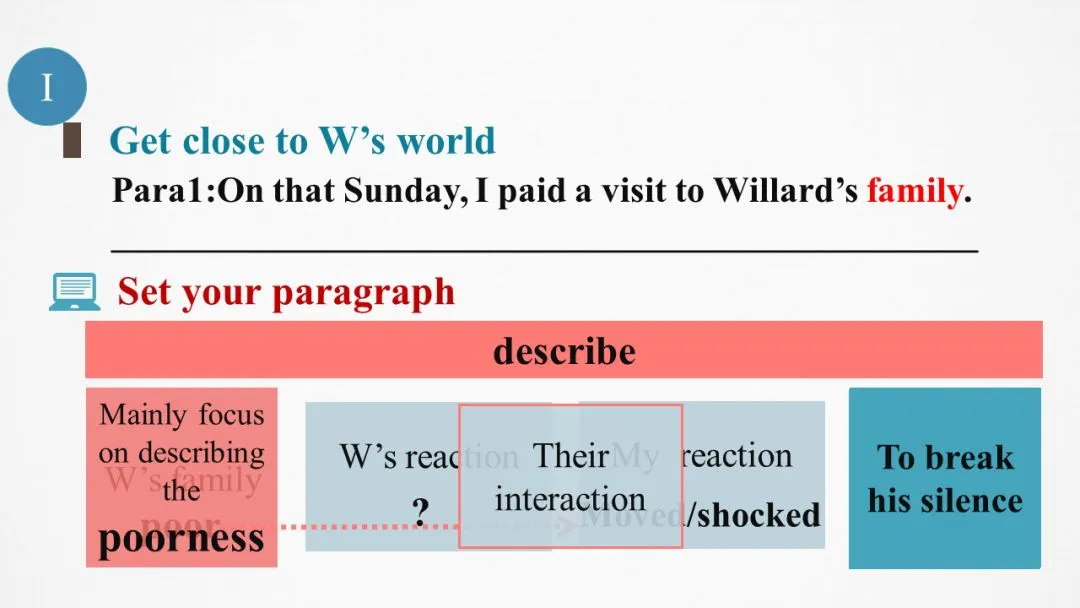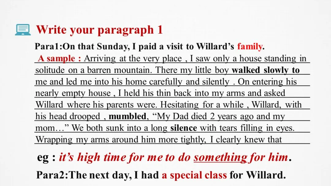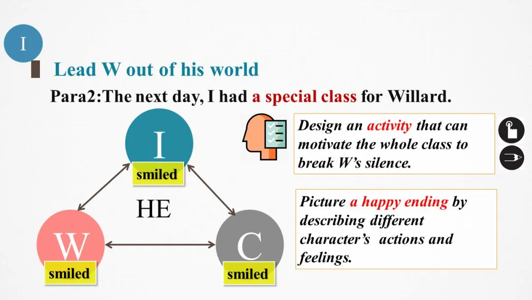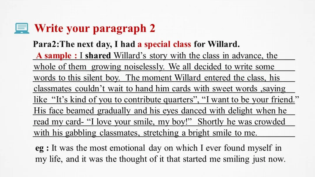 本段中新增次要角色“同学们”,需要构建“I”、Willard和classmates三者之间的行为互动和情感互动。三个角色最后都是指向和谐美好暖心的结尾。因此从老师的角度看,作为老师的“I”所给的a special class需要写作者进行合理设计专门为Willard举行的班级活动,比如为他的捐赠颁奖、和学生分享Willard的故事呼吁全班为他做一件事或者邀请校长参加班会鼓励Willard。参考视频:小猪佩奇幼儿园来了新朋友,老师如何引导小朋友互动。