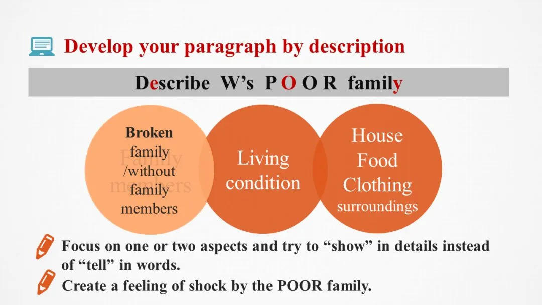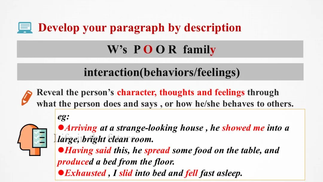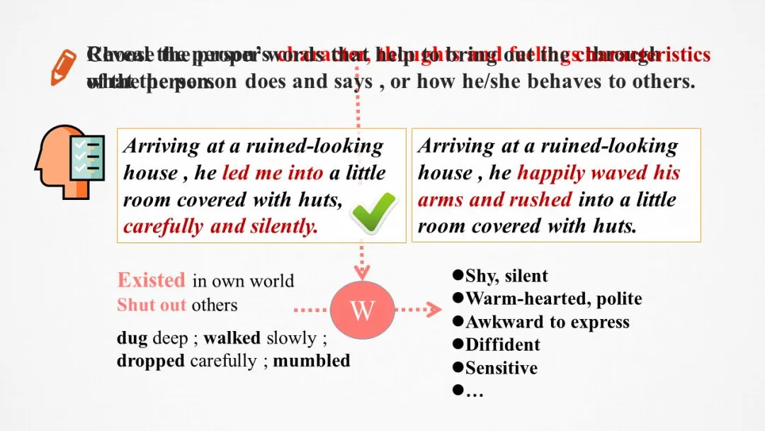 写作小贴士:人物的行为举止和情绪变化应符合人物本身的特点;学会用细节表述而不是直接用语言说明。
