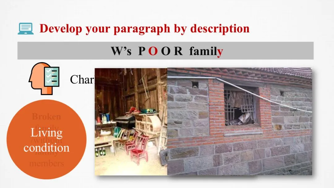 帮助学生整理困苦家境描写的不同角度:家庭成员、生活条件(吃穿住)。通过“我”的角度用细节描述小男孩的家境和小男孩的情绪流露。配图用来刺激学生思维。