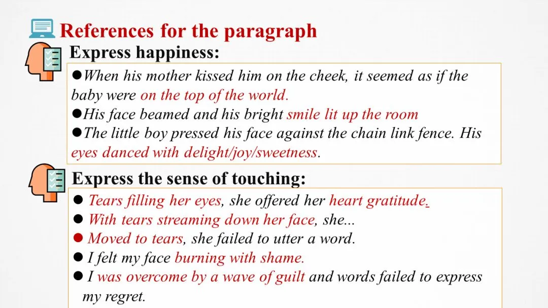 语言构建:提供表达快乐和表达感动的语句素材帮助学生进行续写。
