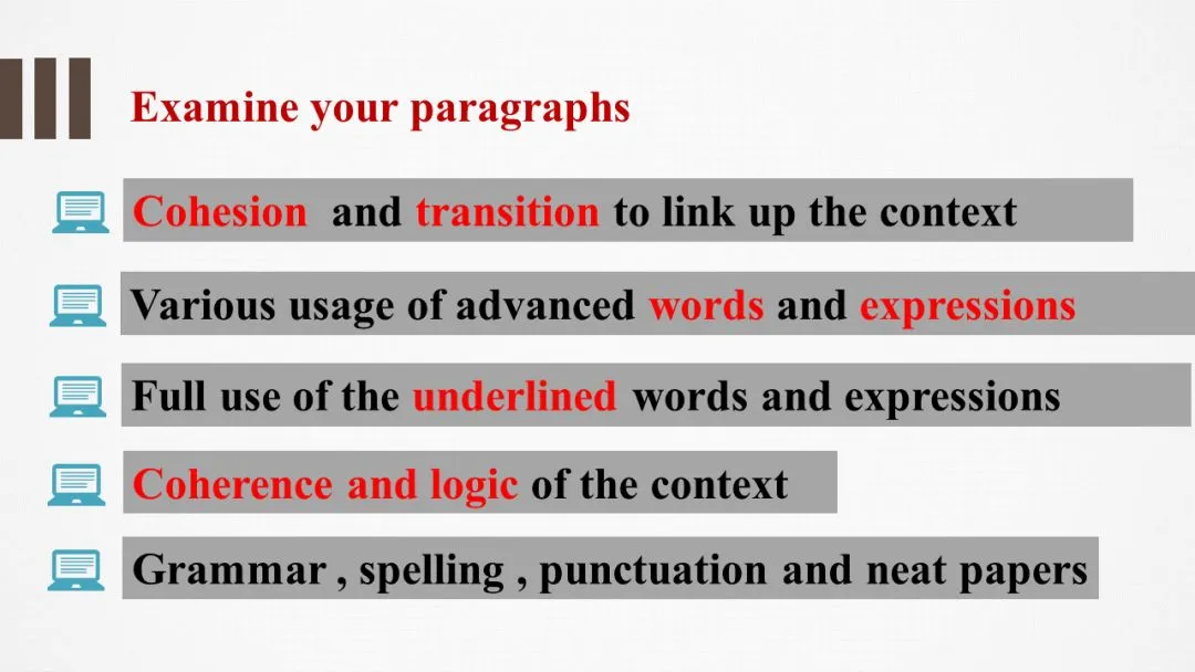 最后,就从语言逻辑、连贯性、词汇丰富程度、高级语法运用、划线词的使用以及拼写卷面标点等各个方面协助学生检查续写完成的作文内容。