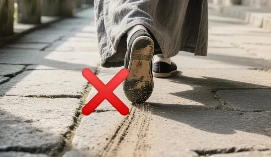 如果拖着脚走,让人感觉这个人很累,两条腿都拖不动。不仅自己的心也会随之无力,不能起一种鼓励别人精进的心,而且还会动他人的心念,别人听了这种鞋子拖在地上的声音,心里也不舒服。