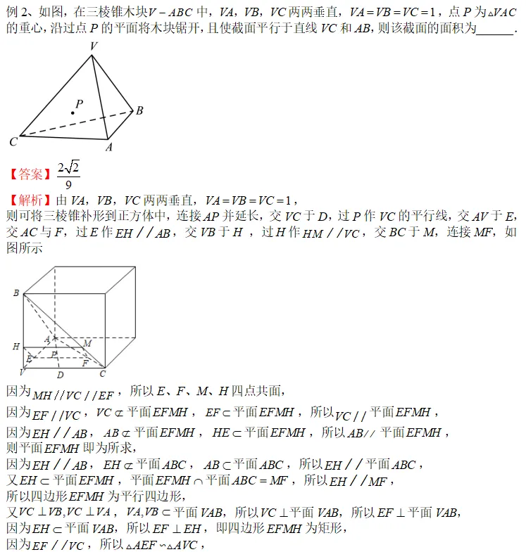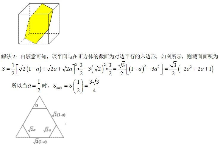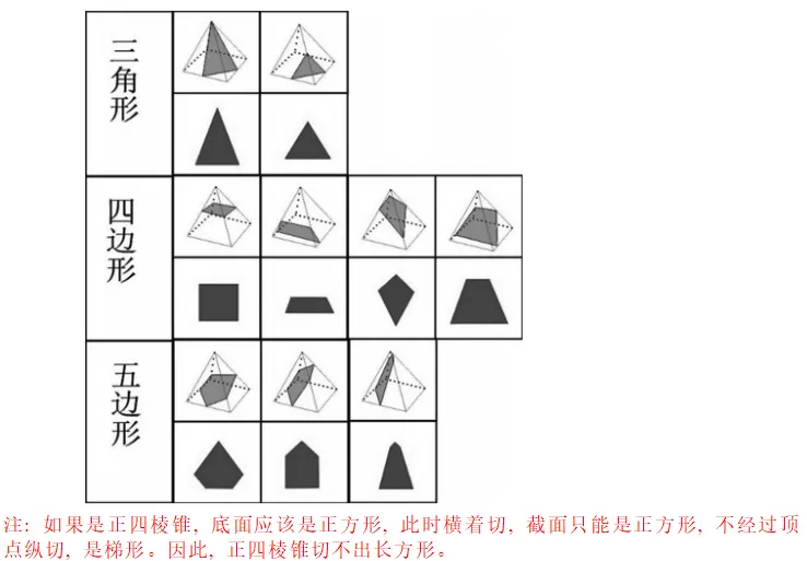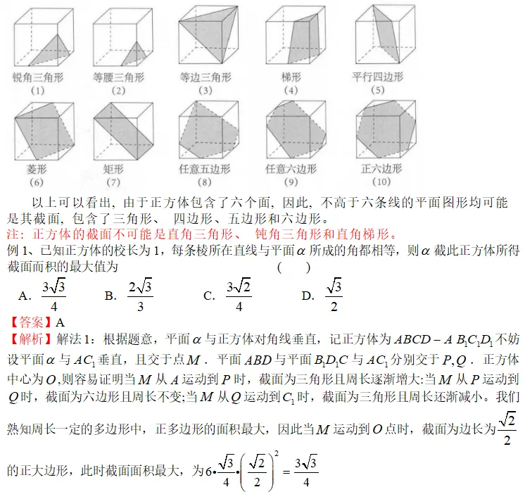 立体几何注重形象化和简洁性,可以锻炼直观感知、逻辑思维能力、空间想象能力,养成有条理地进行推理的习惯,是高中数学教学的重要内容之一。在立体几何中,截面是指用一个平面去截一个几何体(包括圆柱,圆锥,球,棱柱,棱锥、长方体,正方体等等),得到的平面图形,叫截面。立体图形的截面方式,总共有三种,分别为横截、竖截、斜截。学生对截面问题的思考必须经历识图、想图到构图的过程,要通过观察、分析、想象、推理、计算才能加以求解。本微专题对常见几何体的截面图进行简单的介绍和应用分析,希望能够提升学生的融会贯通意识,有效培养学生的数学思维能力与学科核心素养。一、正方体的截面