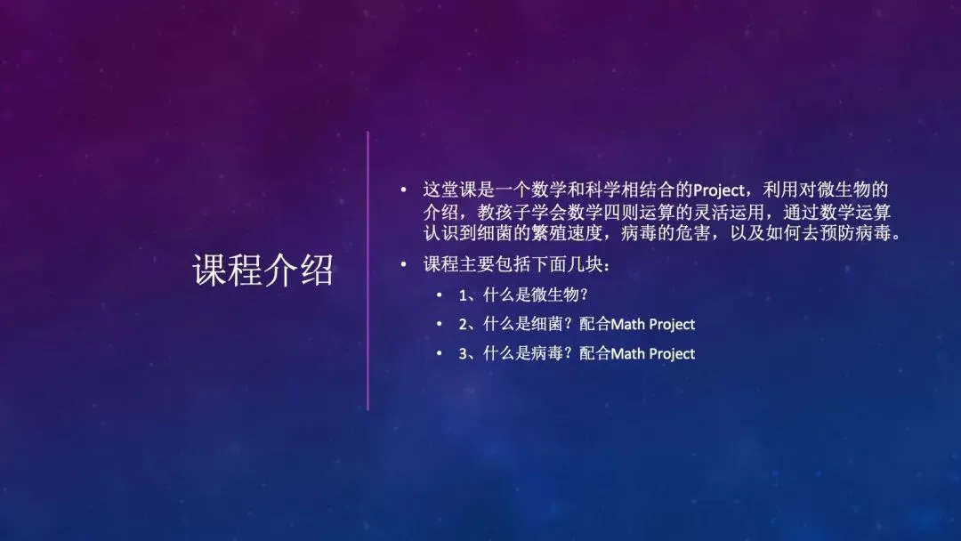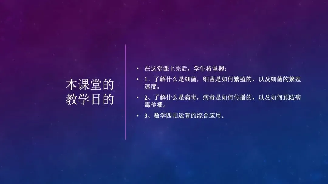 上面就是我做的这份完整教案。我做这份教案的目的,就是为了让孩子理解什么是细菌、什么是病毒,让他们不必为细菌和病毒而恐慌,而是通过运用数学工具,解决一个又一个的问题,从而更深入地了解微生物!
