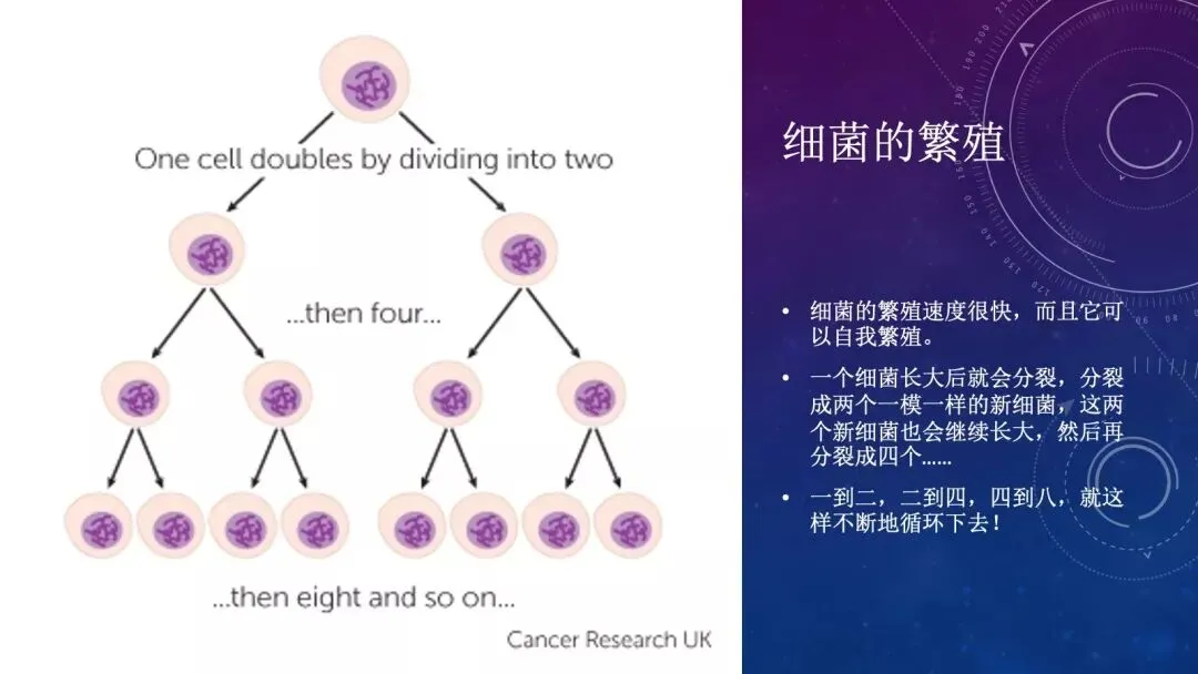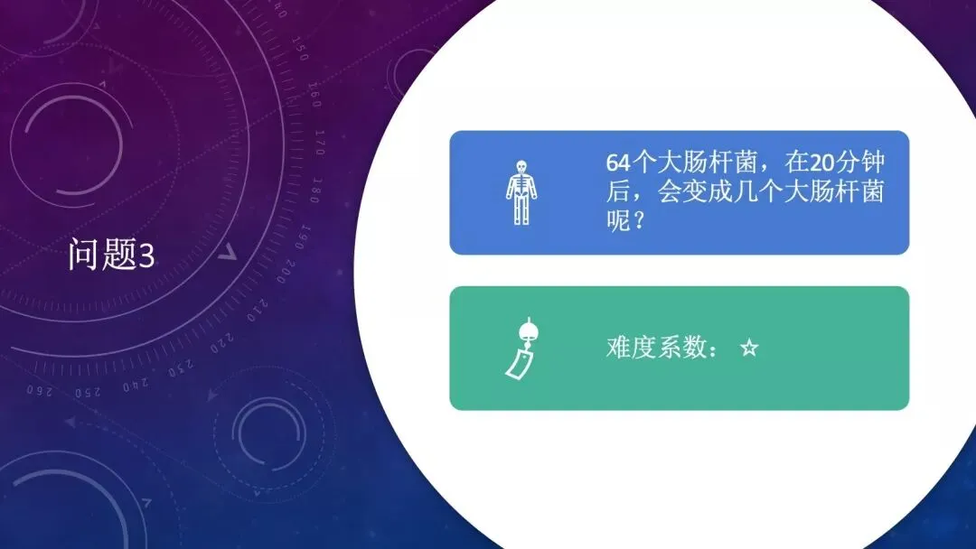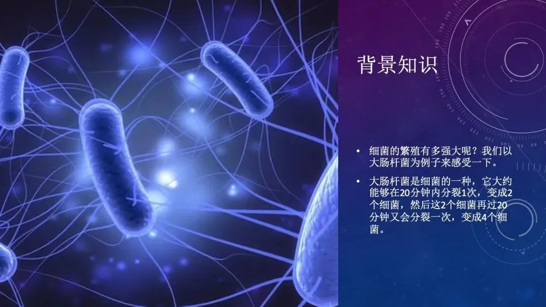 这儿是背景知识,我用大肠杆菌做例子,告诉孩子这个细菌每20分钟,分裂一次,从1个变成2个,再过20分钟,再分裂一次,从2个变成4个……