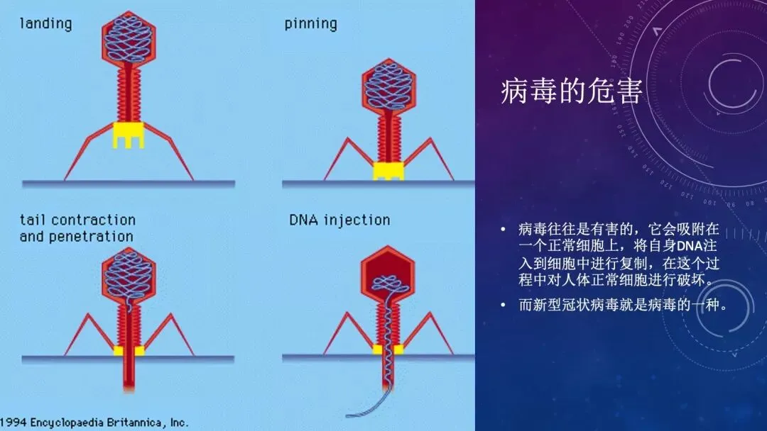 然后讲述病毒的危害。它是通过吸附在细胞上,将自身DNA注入进去,从而影响好的细胞。