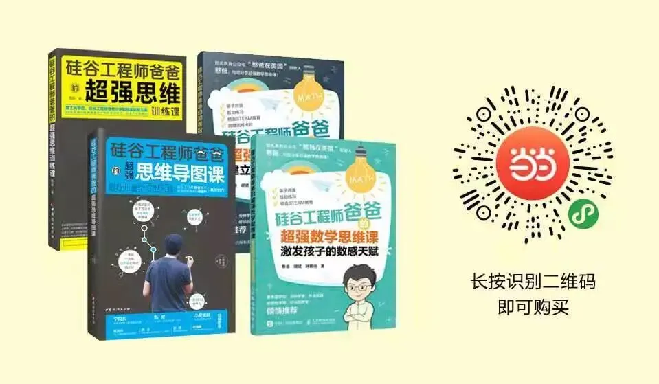 我写的硅谷工程师爸爸系列丛书,包括数学思维和思维导图篇,它是用美国最流行的PBL项目学习方式,结合STEAM教育来提高孩子数学思维和思维导图应用能力。扫描下方 二维码 或点击左下角 阅读原文 可以购买!