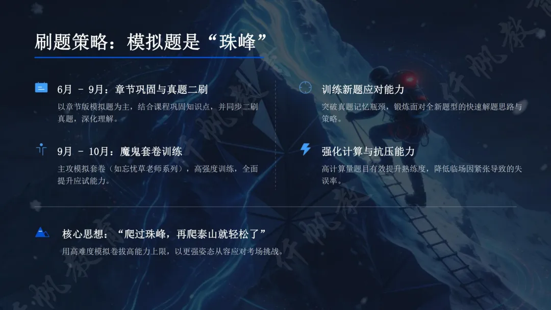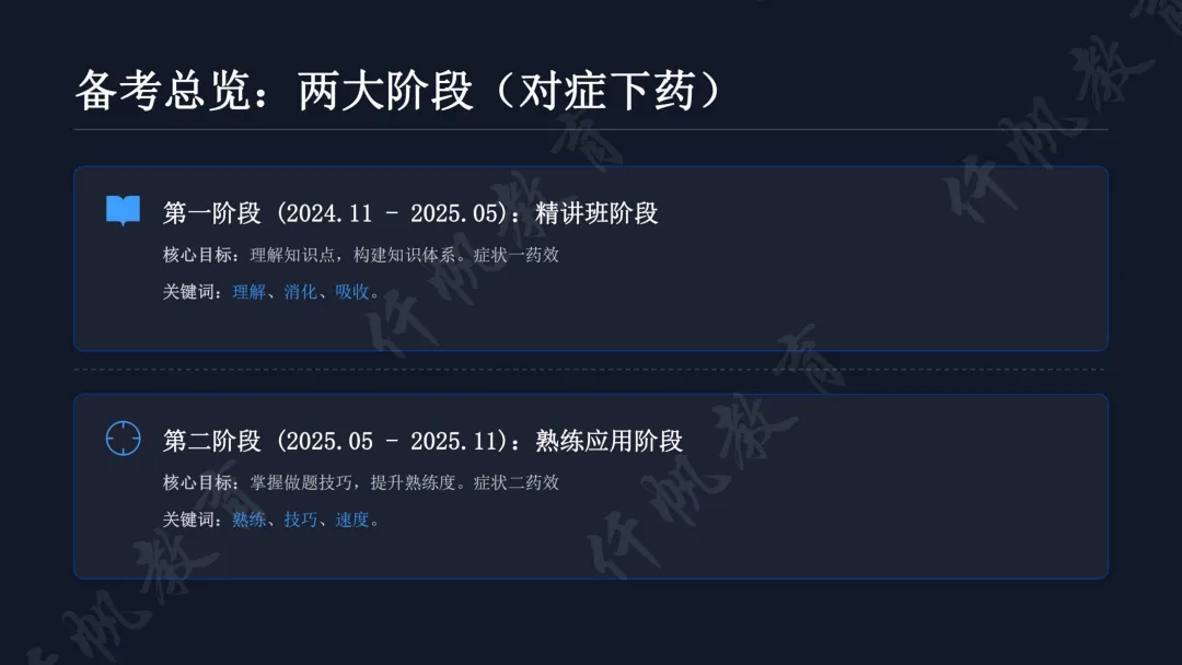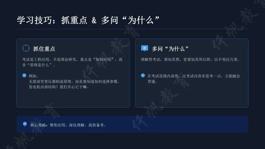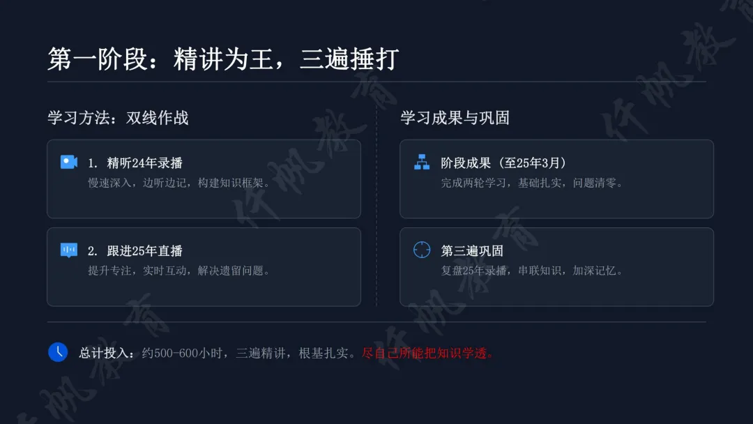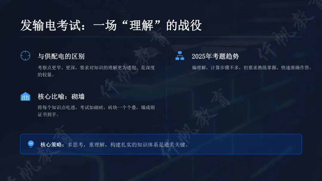 备考分阶段推进,发输电备考尤为注重“理解+熟练”双核心。第一阶段(6个月)以精讲班为核心,通过24年录播构建框架、25年直播解决疑问,投入500-600小时深耕知识点,用“思想实验法”将抽象概念具象化,聚焦知识应用而非纯理论,多问“为什么”实现融会贯通。第二阶段(6个月)侧重熟练应用,通过章节模拟题巩固、真题二刷深化,再以高难度模拟套卷拔高应试能力,目标实现“快速做对”。