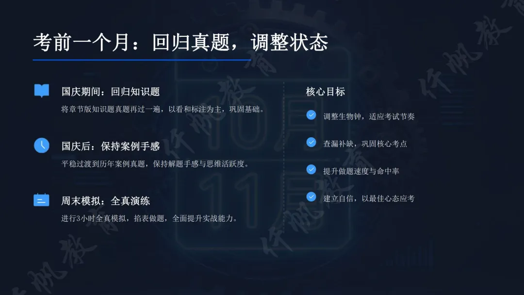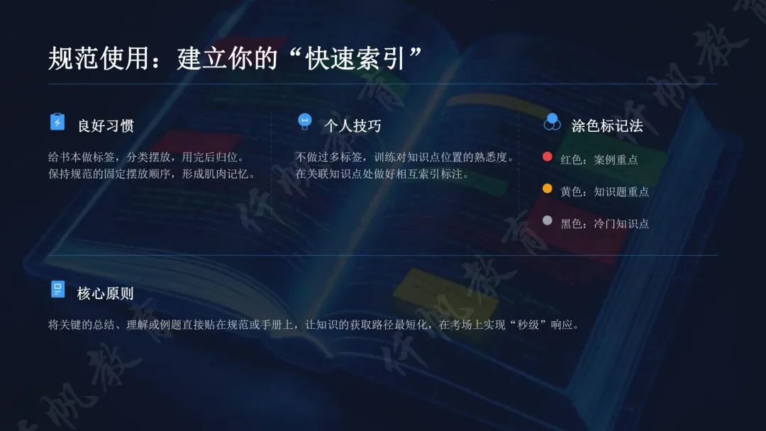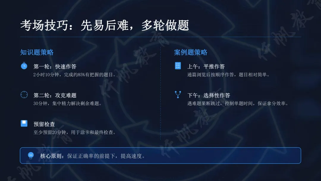 考前冲刺聚焦细节,考前一月回归真题,通过全真模拟调整节奏;考场采用“先易后难”策略,知识题分两轮作答+预留检查时间,案例题灵活取舍。同时建立规范“快速索引”,通过标签、涂色标记优化知识检索效率。