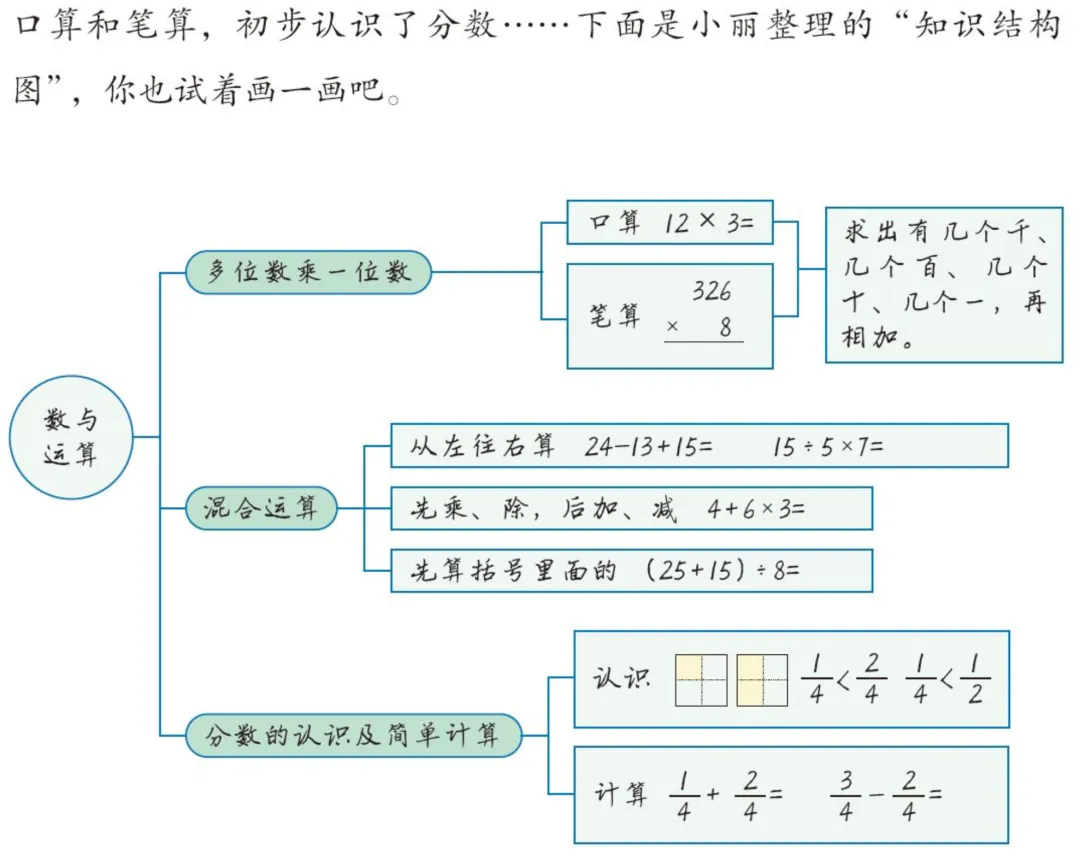 但是,并不只有这一种画法,例如卢老师来画的话,会按“数”与“运算”分类。本学期新认识的数是分数。而运算分成两部分:一部分是在分数单元中学习的加法和减法,另一部分是“多位数乘一位数”这个单元中学到的乘法。然后在这两个基础上,再来理解“混合运算”。