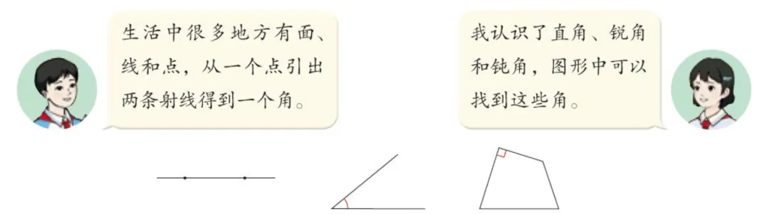 接下来的“从一个点引出两条射线,得到一个角”,要能够联想到:这个点就是顶点,这两条射线就是角的边。我们曾经练习过一道题,画完角以后要求标出角的各部分名称,当时有的同学就给忘了:角的各部分名称就是指顶点和边。