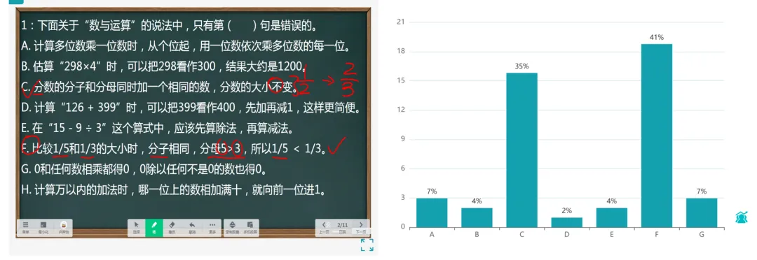 有35%同学选对了第3项。但糟糕的是更多即41%的同学选了第6项,经过提问,选这项的同学承认是没理解“分母5>3”,我猜想他们是与“分数单位”的意义混同了,但当下没学分数单位,所以还是回归当时课堂上所总结的比较法则来进行对照。