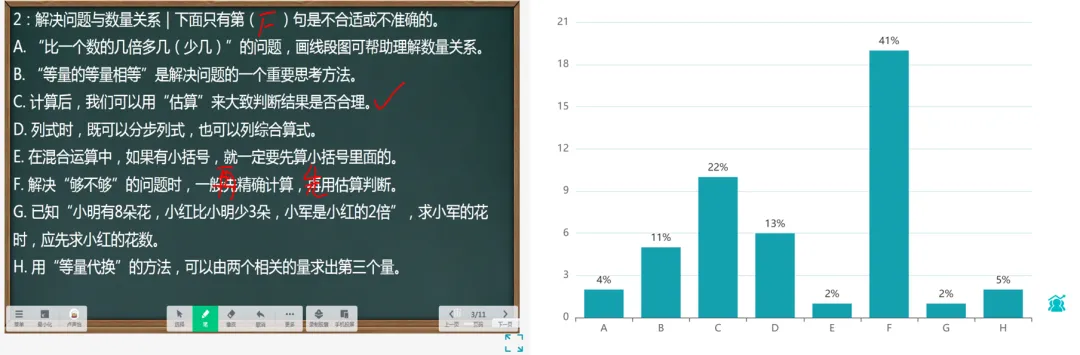 有41%的同学选对了第6F项,但也有10位同学选成了第3C项,我访谈其中的同学,他们对这句话的理解是“精确计算的题,就不应该用估算,所以这句话是错的。是正选。”