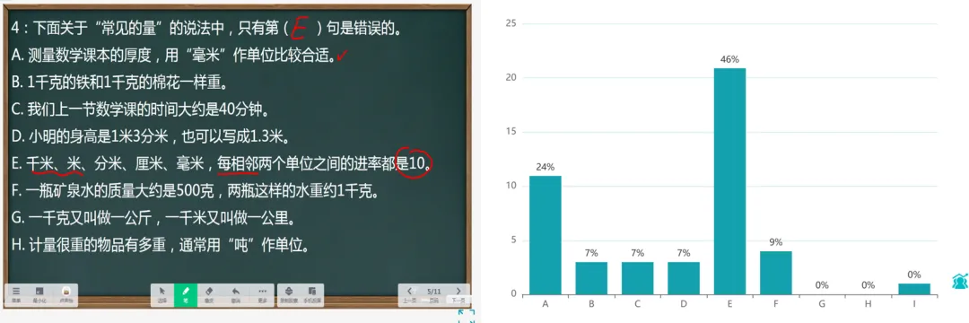 有21个同学选对了第5E项。但是,也有11个同学选错成1A这一项,即“测量数学课本的厚度,用毫米做单位比较合适”。在他们心目中,可能还是觉得“厘米”是更适合的单位,后来我做了访谈,一位错选的同学说“我觉得它正好是1厘米厚”,你觉得对这样的同学应当怎样“劝解”?
