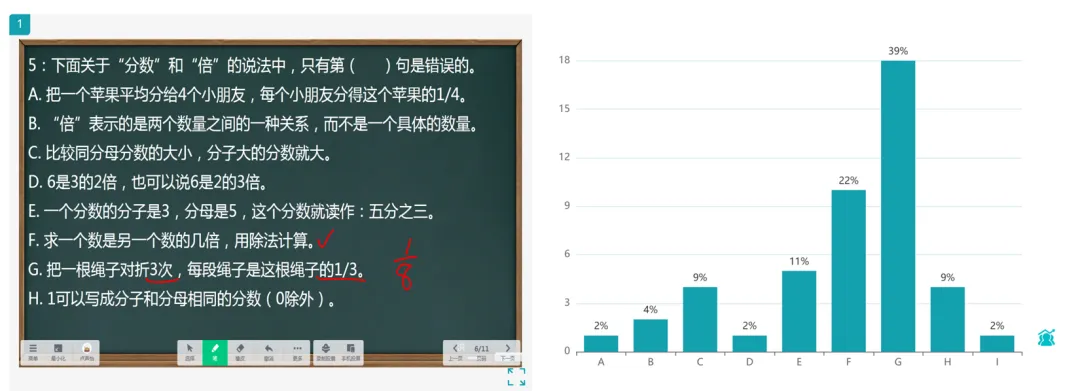 39%的同学选中了第7G项,理由是“绳子对折三次,每段应该是1/8,而不是1/3”。