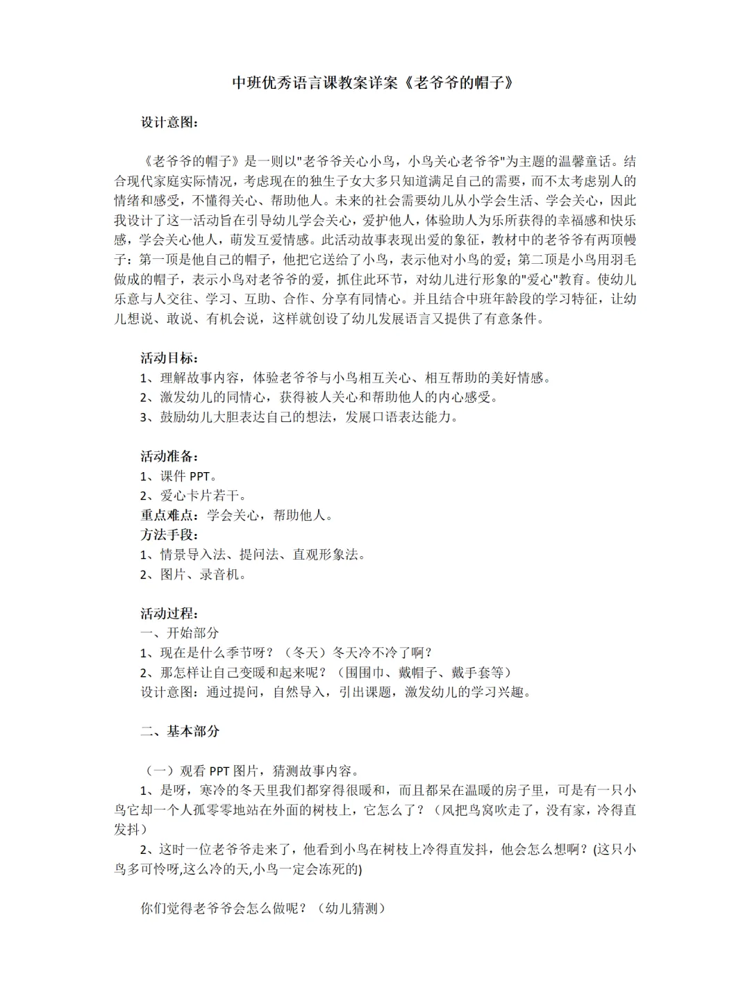 关键词:老爷爷的帽子 | 幼儿园 |中班语言领域