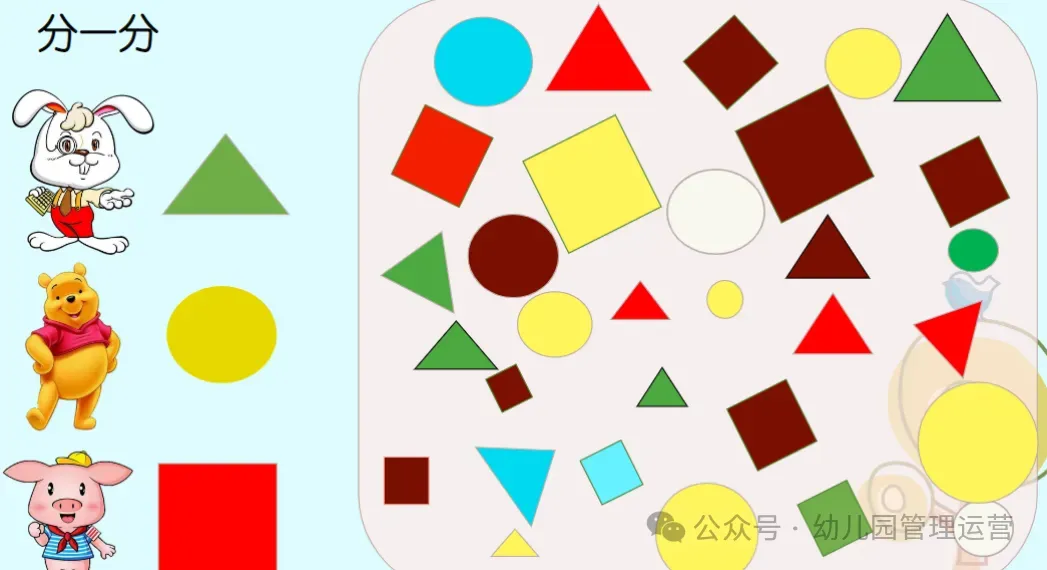 做完,我请小朋友来帮忙。(幼儿按图形进行排序,圆形、三角形、