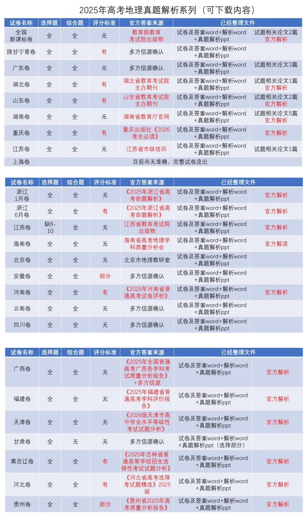 购买过我们2024年高考地理真题解析的老师都知道,我们自始至终所给出的答案均为官方答案,从来没有出过问题。2025年,我们受到了更多人的关注,以至于大家想到高考地理官方答案,就会来我们公众号看看。为此,我们开发了高考地理真题解析系列,致力于为大家搜集官方答案和解析。以下图表是我们目前制作的2025年真题解析系列内容。下面是关于2025年高考地理真题解析课件系列的介绍和获取说明,如果有需要,可以购买支持我们。购买老师可以获得2025年全国各省市高考地理真题解析课件(含授课PPT、学生用纯题目试卷、教师用含解析试卷、其它附赠资料),无法获得官方试题和答案的除外。截止到1月6日,我们已经完成浙江1月卷,浙江6月卷,湖北卷,全国新课标卷,广东卷,湖南卷、山东卷、云南卷、西北卷、四川卷、重庆卷、河南卷、江苏卷、北京卷、安徽卷、江西卷、海南卷、福建卷、广西卷、天津卷,黑吉辽蒙、河北、贵州23套整卷的官方答案搜集及解析编写,完成甘肃卷选择题部分官方答案搜集及解析编写,仅剩上海卷没有进行制作。截止到1月6日,全国卷、山东卷、重庆卷、江西卷、广西卷、湖南卷、福建卷、天津卷、浙江卷(1月、6月)、湖北卷、河南卷、黑吉辽蒙卷(吉林省发布)、河北卷、江苏卷、贵州卷共16份试题,已经公开发布了官方答案和解析(有的是部分题目)。其中在官方发布前我们已经发布解析和答案的,官方发布的答案与我们在这之前发布的答案完全一致。由于上海卷、甘肃卷历年不发布官方试题和答案,因此2025年的真题解析系列课件,已经基本完成。2025年全国部分省市高考地理真题解析课件的价格为129元,购买后添加进QQ群,通过QQ群文件进行下载。后期若我们对课件中的解析进行修改,可以自主通过QQ群进行下载,免费获取更新版内容。单独购买某个高考真题解析课件,29元每个。购买老师请长按扫码联系微信客服。①解析课件中的答案保证为官方答案,否则我们直接不会发布;②解析内容尽可能保证准确,贴近出题人思维,但是解析为个人看法,不同老师看法不同,无法保证能够说服全部人。