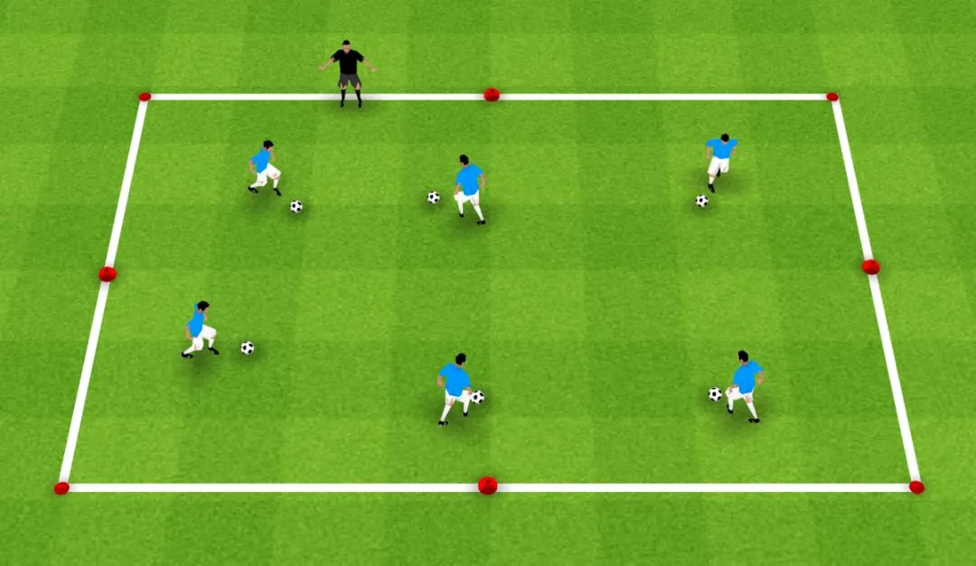 2. 之后球员们进行带球比赛,球员在场地内自由带球,当教练发出信号时,球员必须用制定的动作带球绕过标志盘,每次淘汰1名最慢的球员,直到决出胜者。