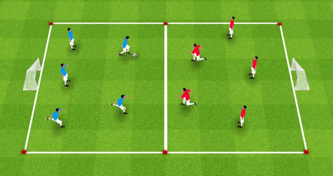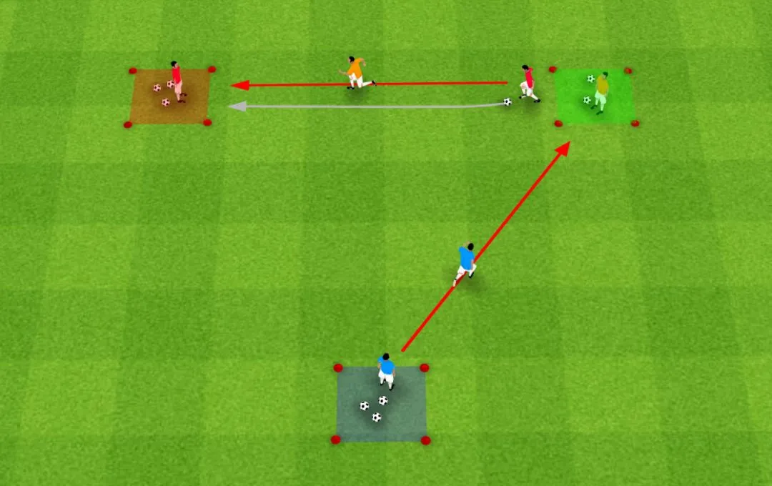 3. 练习开始后,球员要从自己的区域出发去抢其他区域中的足球。在练习过程中,球员不能防守来抢球的球员,也不能抢夺带球人脚下的球,只能去抢其他组区域内的足球。